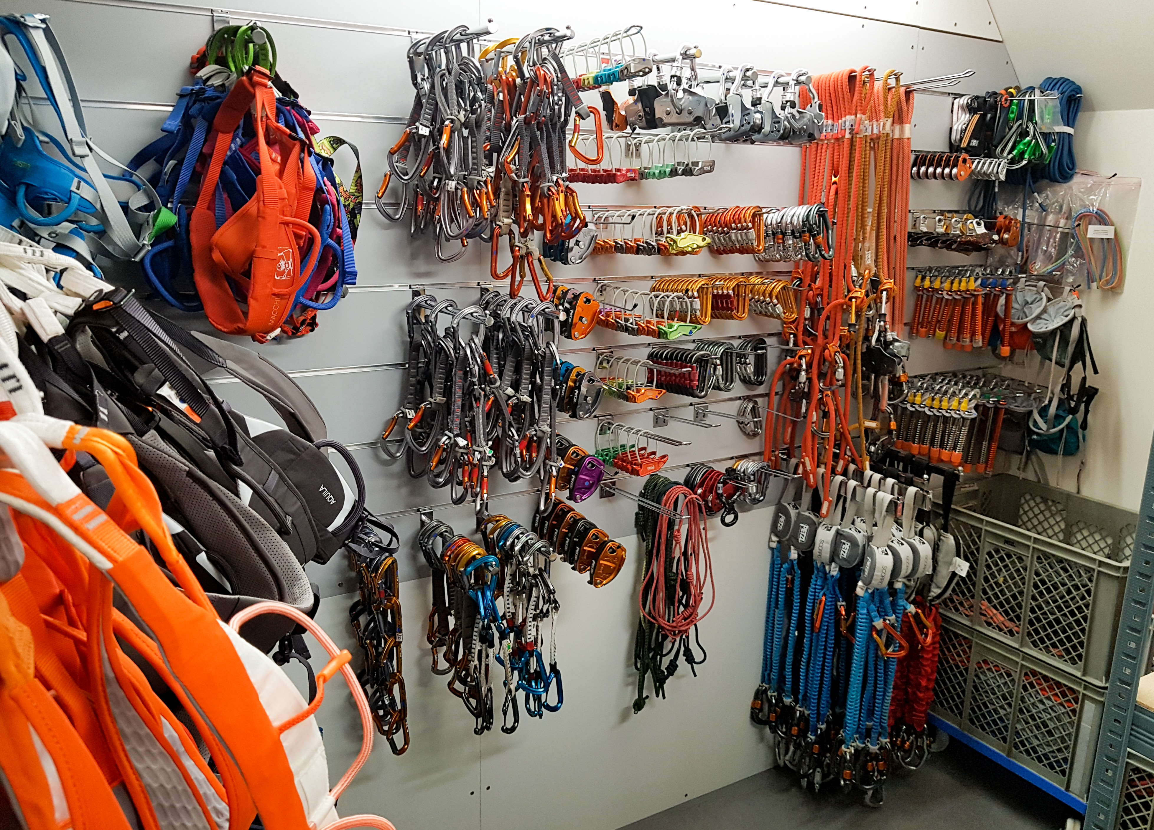 Loin des projecteurs et des paillettes du showroom, d’autres membres de la famille de mon mousqueton mènent quant à eux une vie plus rude : ils sont utilisés lors d’événements dont la marque est partenaire, comme l’Ice Climbing Écrins, auquel nous avons participé le mois dernier (janvier 2019 ; si ce n’est pas déjà fait, allez lire notre compte rendu !). Le parc de prêt est composé des équipements les plus courants en escalade, alpinisme et cascade de glace : descendeurs, dégaines, baudriers, cordes, crampons, piolets, etc. Bref, là encore de quoi remplir nos étagères ! On y trouve du matériel qui date de quelques années déjà mais aussi les dernières nouveautés, comme la toute nouvelle version du piolet de cascade de glace Nomic (un petit bijou, demandez donc à Zoé ce qu’elle en pense !). Après chaque sortie, le matériel est vérifié puis trié : retour dans le parc de prêt ou direction le rebus. Pour donner une idée de l’ampleur du parc de prêt, en 2018 Petzl a prêté environ 2 000 lampes sur une soixantaine d’événements.