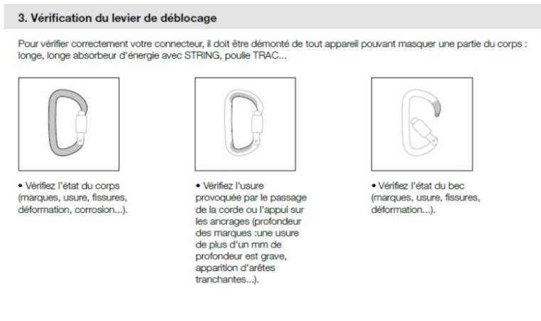 Dans cette histoire familiale, certains mousquetons sont dans les mains d’une guide (même si statistiquement tomber entre les mains d’un guide serait plus probable, mais nous gardons espoir que la parité arrive un jour !). Mme la Guide a à cœur d’en prendre soin, de les vérifier régulièrement et de remplir un suivi des E.P.I. (équipement de protection individuelle) chaque année. Ce suivi annuel est obligataire pour les professionnels et les clubs. Si, comme moi, vous n’êtes pas hyper calés sur la façon de vérifier l’état de votre matériel, allez visiter le site Petzl, accessibles à tous gratuitement, sur lequel des fiches de procédure de vérification et de suivi des E.P.I. sont disponibles au format PDF. Pour faire court, procédez d’abord à une comparaison avec un produit similaire pour détecter d’éventuelles déformations ou perte d’éléments. Faites ensuite une vérification visuelle et tactile. Par exemple pour un mousqueton vérifiez l’état général du produit (marques, fissures, déformation, usure, état du bec, etc.) puis du doigt (marques, fissures, état du rivet, ouverture, fermeture, etc.) et de l’éventuelle bague de verrouillage (même chose que précédemment et vérification de la course complète de la bague). Pour nous aider à déterminer quels produits sont encore bons ou à mettre au rebus, plusieurs exemples d’articles usagés sont photographiés à la fin des fiches de procédure de vérification des E.P.I., avec pour chacun une indication de ce qu’il faut faire. Si le doute persiste, demandez conseil à une personne plus expérimentée !