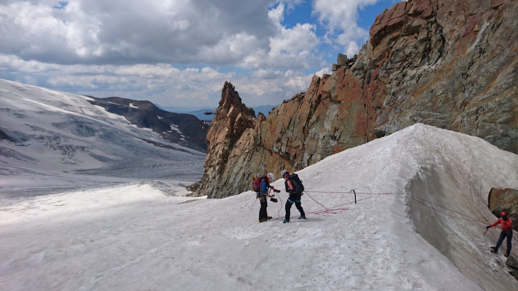 Avec le sourire, nous empruntons la descente du sommet jusqu’au rappel qui nous dépose au pied du glacier. Il nous reste même du temps pour jouer sur la neige avant la dernière benne. Exercices d’ancrages et de mouflage au menu, il faut sauver nos guides!