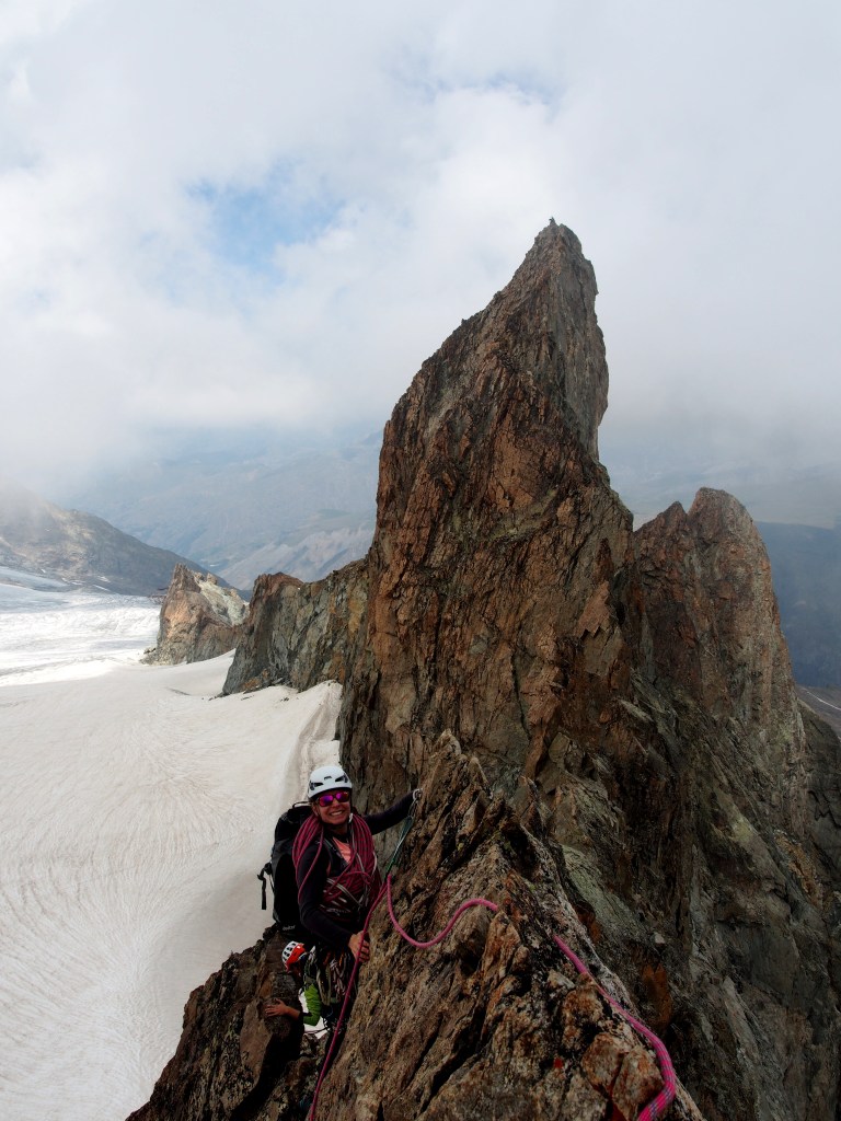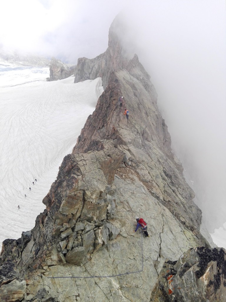 Nos encadrants nous conseillent sur la pose de protections; on apprend à bien utiliser les becquets tout le long de l’arête pour l’assurage dynamique en corde tendue. Le terrain de jeu choisi se prête très bien au jeu de chercher la bonne fissure, le becquet solide, le piton caché… Il y a même quelques spits sur place pour nous donner plus de sérénité pendant nos recherches. Nous évoluons doucement mais surement sous le regarde attentif de Bego, de Seb et de la Meije, trois encadrants de rêve! On grimpe un gendarme, une petite désescalade, on traverse une partie facile de l’arête, on arrive à un court rappel et on attaque la longueur finale pour arriver au sommet. Tout se déroule fluidement, nous sommes 3 cordées de 2 et tout le monde passe en tête à son tour, nous sommes venues pour jouer, pour apprendre et gagner en confiance, et voilà, réussite complète, la journée a été au top!