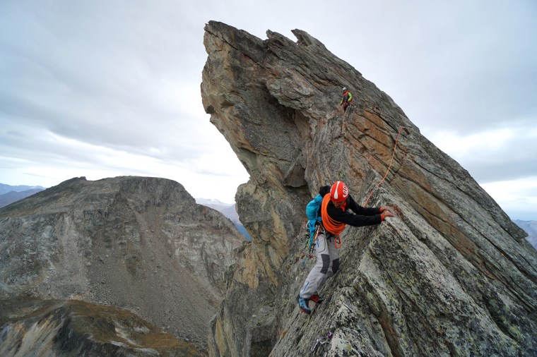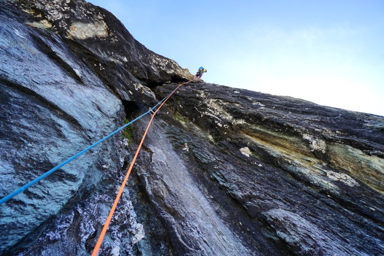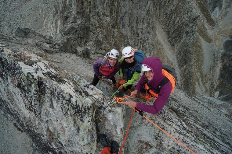Aucun équipement n’est en place et l’arête large permet des départs simultanés. Avec une météo moins belle que la veille il faut redoubler d’efficacité. Nous grignotons rapidement, enfilons nos baudriers et c’est parti! Nous papoterons plus tard.
