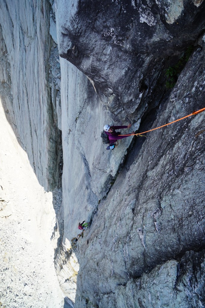 Après 8 jolies longueurs, la voie retrouve l’arête qui s’effile, nous progressons en corde tendue. Sachez que nous serons en retard pour la soupe ! Un rappel de 30m puis une courte désescalade aérienne nous maintiennent en alerte. La fatigue commence à se faire sentir. Un nouveau rappel de 20m, une petite traversée en corde tendue mènent à un long rappel de 50m. Seb en éclaireur nous installe une main courante pour accéder à la sente finale.
