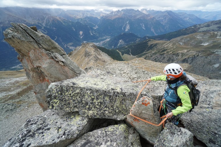 Il nous reste un court passage dans des blocs instables, puis, une belle longueur verticale en 5a qui se protège parfaitement avant d’arriver au sommet. Nous prenons le temps pour quelques accolades, heureuses d’avoir partagées cette belle course. Cependant, l’heure n’est pas aux longs blabla, nous rangeons rapidement le matériel et enchaînons la descente, la voiture n’est pas encore là… Et le tiramisu de Lara nous attend !