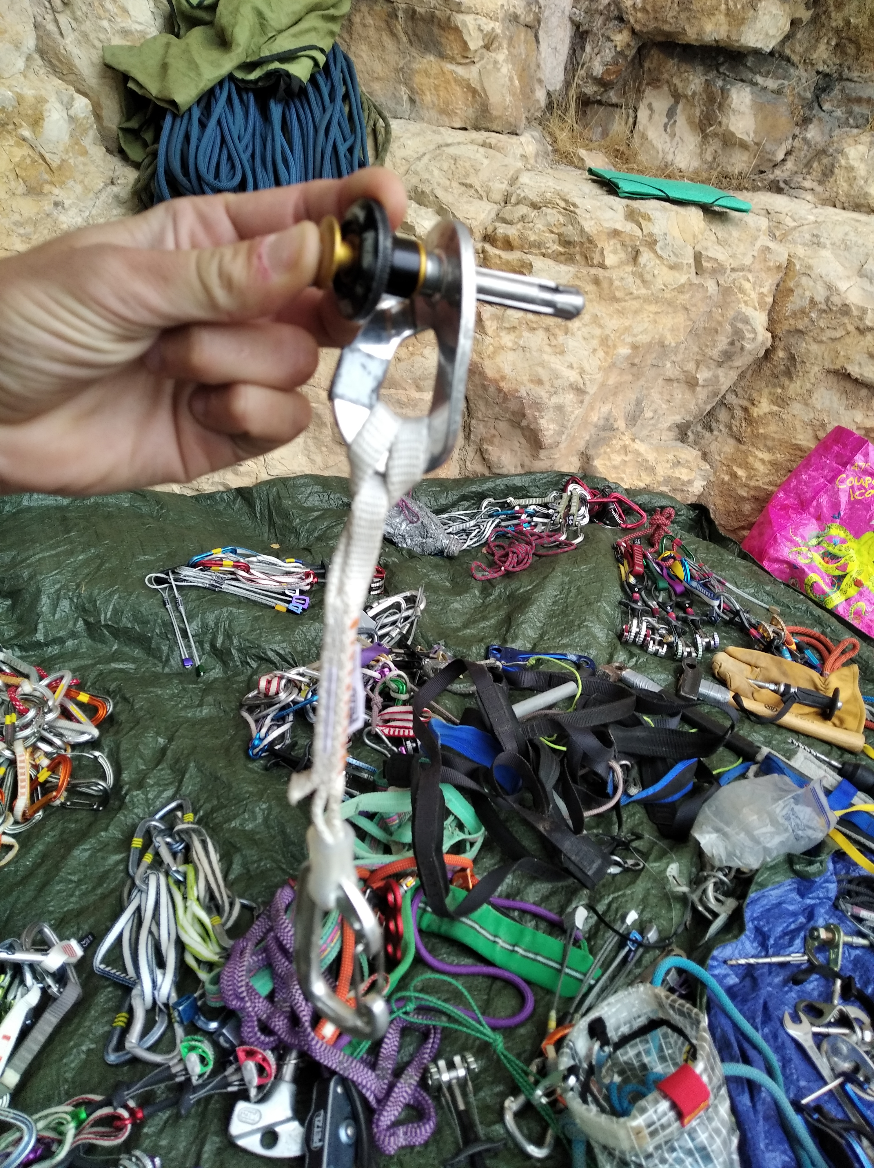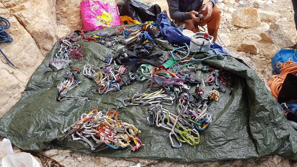 Max, quant à lui, est remonté comme une pile électrique. Il a à cœur de nous transmettre un maximum de contenu ! Après la présentation des techniques et principes de grimpe en artif, l’intégralité de l’équipement est passé en revue.