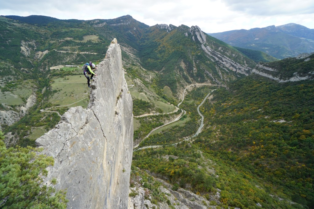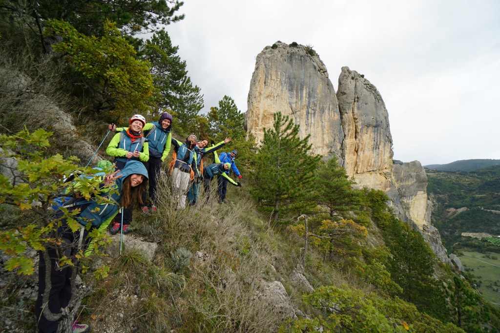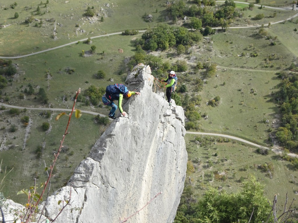 8h, départ pour notre objectif du jour, « Les Bougnats Volants » à l’aiguille de Saint Benoit en Diois dans la Drôme. Nous sommes avertis, plusieurs pas d’une longueur se feront, pour celles qui le souhaitent, en artif (passage en 6c). L’occasion parfaite de mettre en pratique les enseignements de la veille.