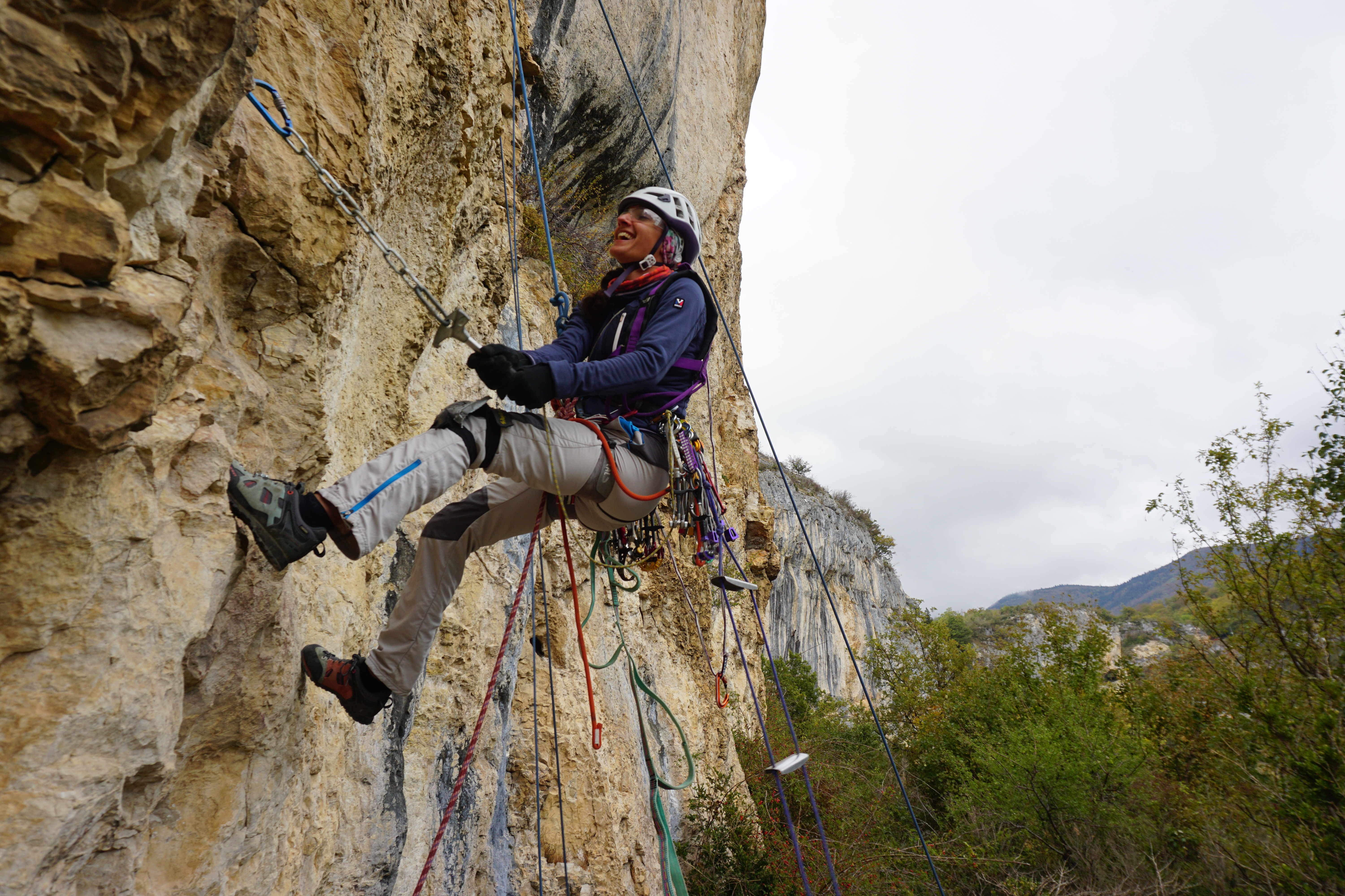 Chargées de tous les kilos de matos nécessaires et d’une belle motivation, nous nous rejoignons au pied des voies d’artif des falaises de Presles, secteur Tina dalle. La douce bruine ne vient pas entacher l’envie et l’énergie du groupe et crée une ambiance plutôt mystique.