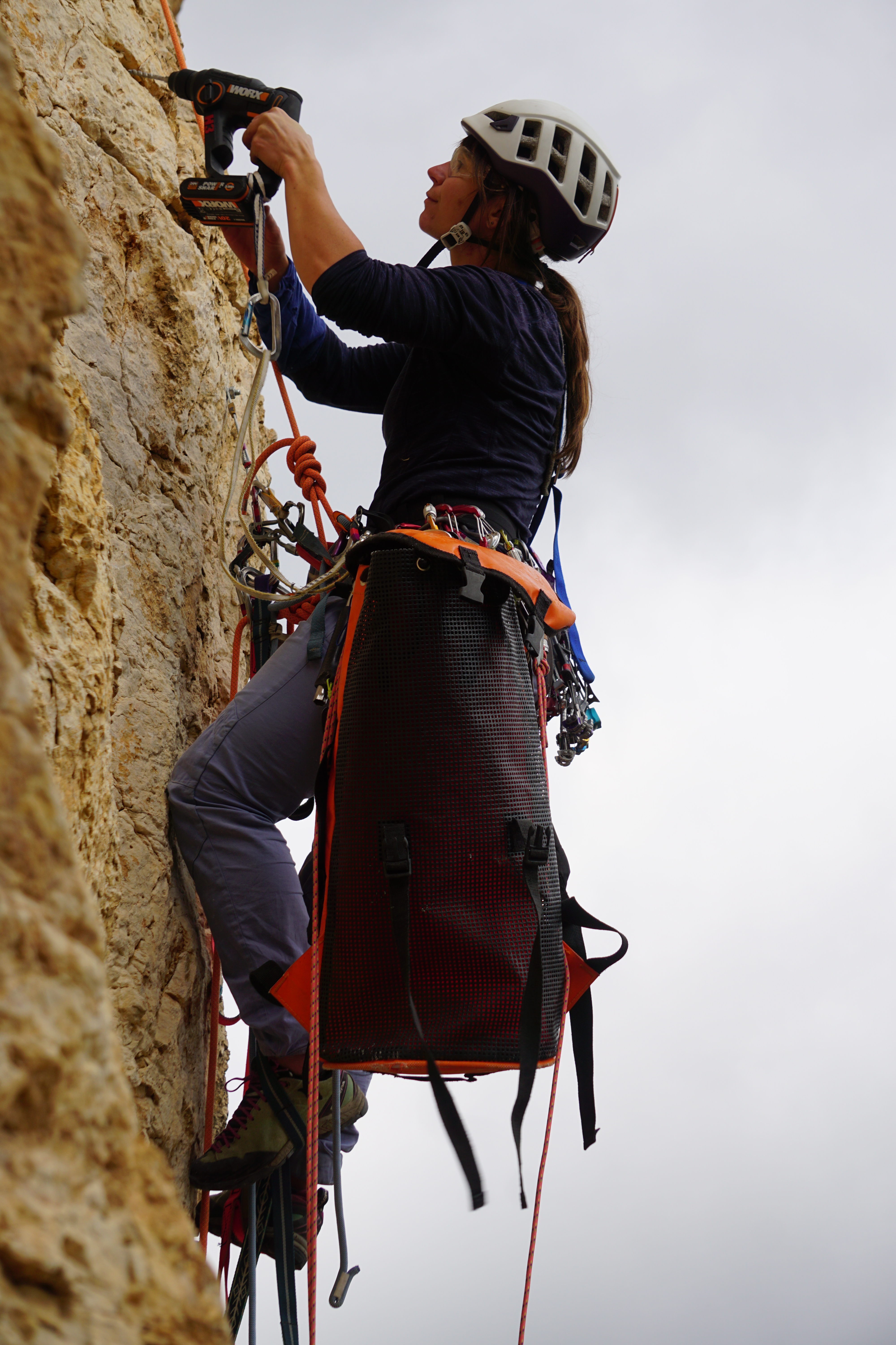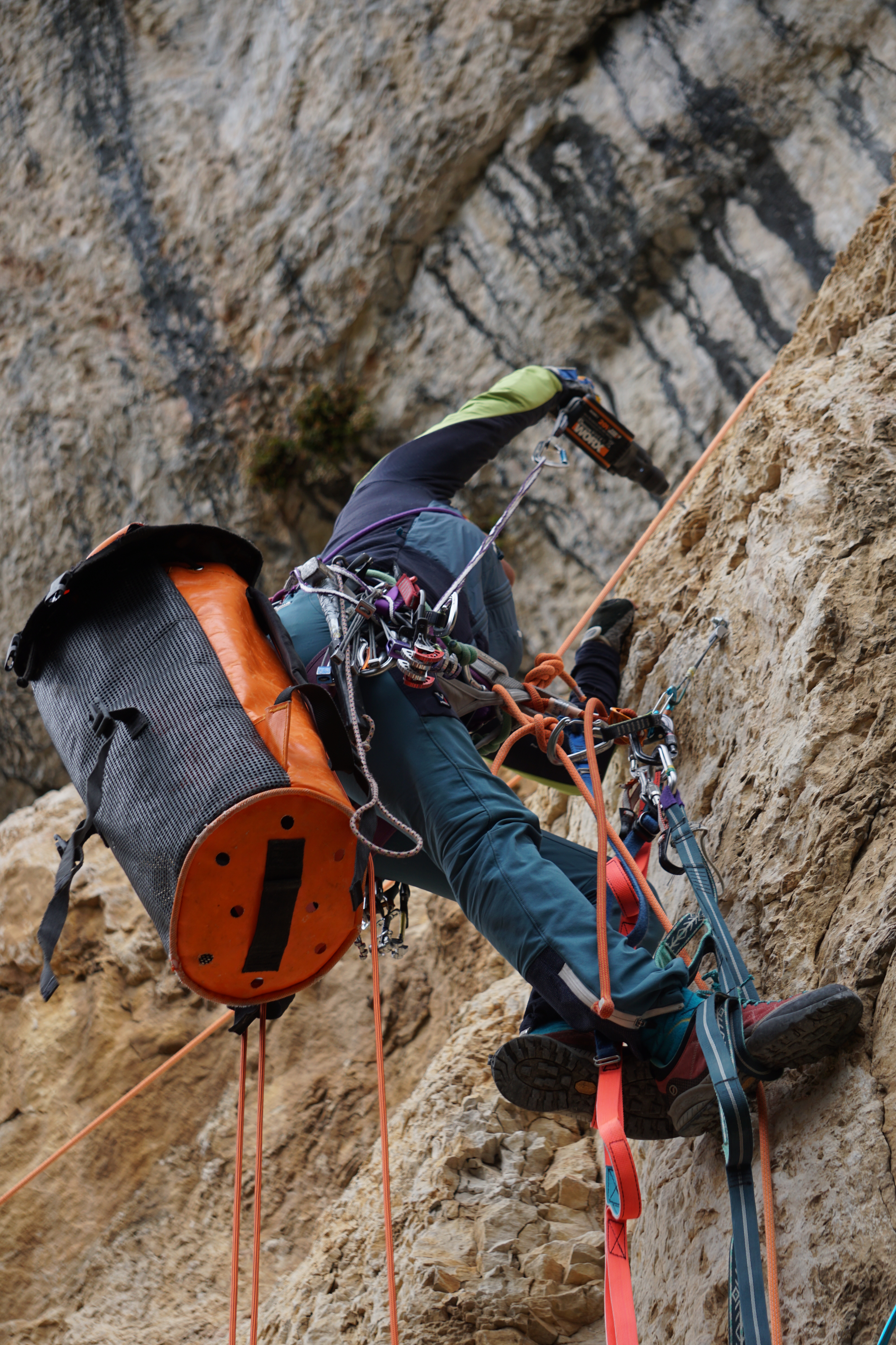 Nous testons même la pose des amarrages amovibles Cœur Pulse, ce spit magique qui peut être mis en place et retiré très rapidement, bon bon … À condition d’avoir un perfo dans sa poche. Nous voilà donc en train de découvrir le fonctionnement du perfo et de l’amarrage d’un point. Toutes les voies sont proches ce qui facilite les échanges entre nous aussi bien verbaux que de matériel, belles rigolades !