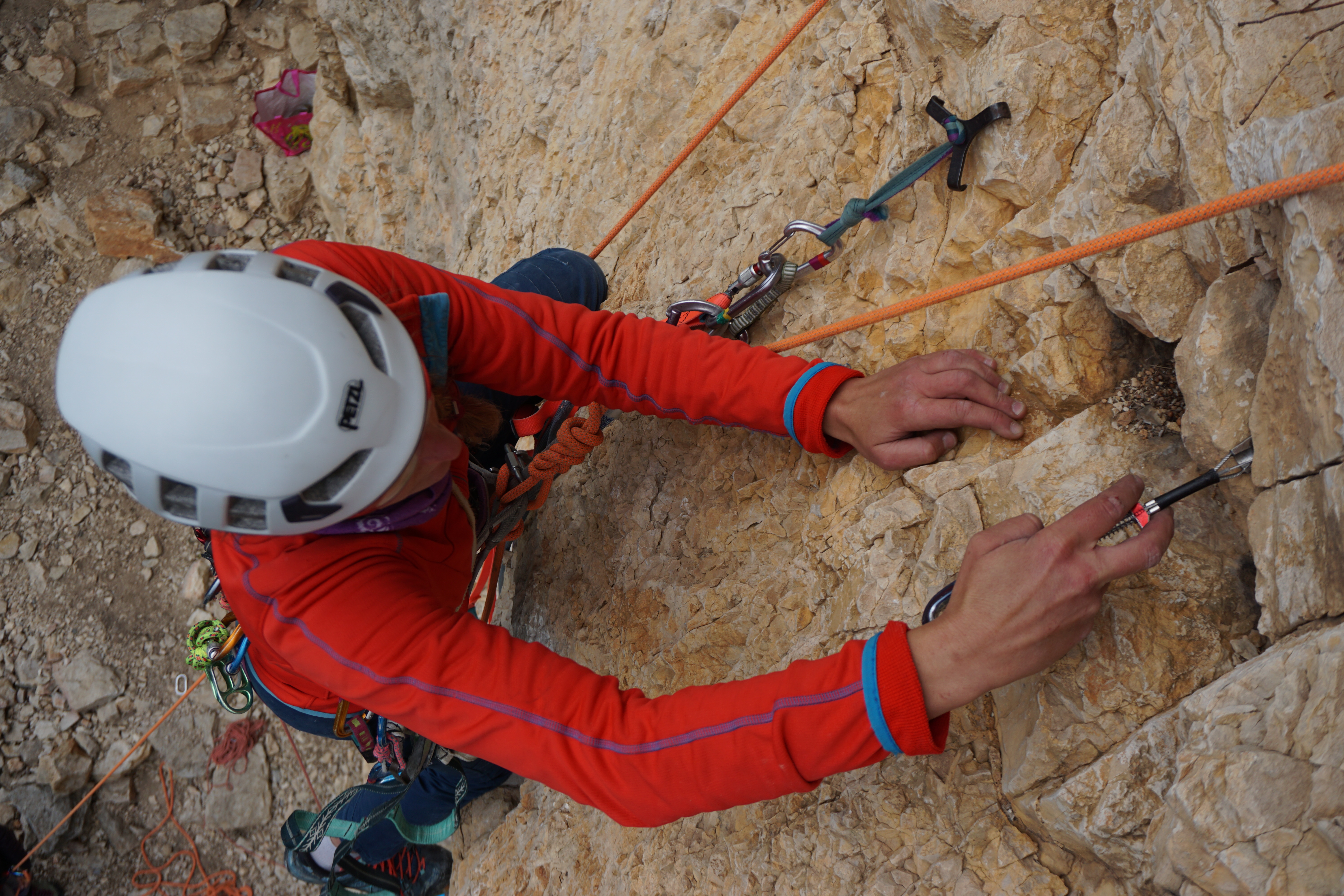 Fini avec la théorie, nous trépignons d’impatience, il est temps de passer à l’action! Perchées sur nos étriers, nous nous essayons à tous types de pose de points d’assurage ou progression; les friends, les coinceurs, les pitons, les crochets goutte d’eau et même les cravates de goujons avec les coinceurs.