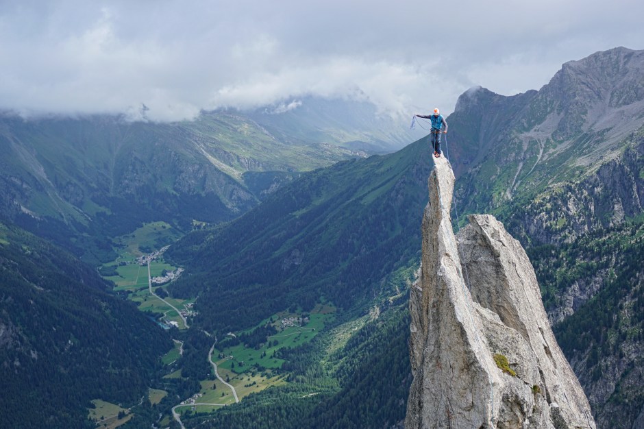On divise le groupe en deux, une partie se dirige avec Max à la Fiamma et une autre décide d’attaquer quelques longueurs de grimpe en terrain d’aventure jusqu’au sommet. La longueur unique pour accéder à la Fiamma, une des aiguilles effilées les plus belles des Alpes, s’avère plus dure que prévu, délicate et exposée. Une fois au sommet la séance de photos est de rêve !