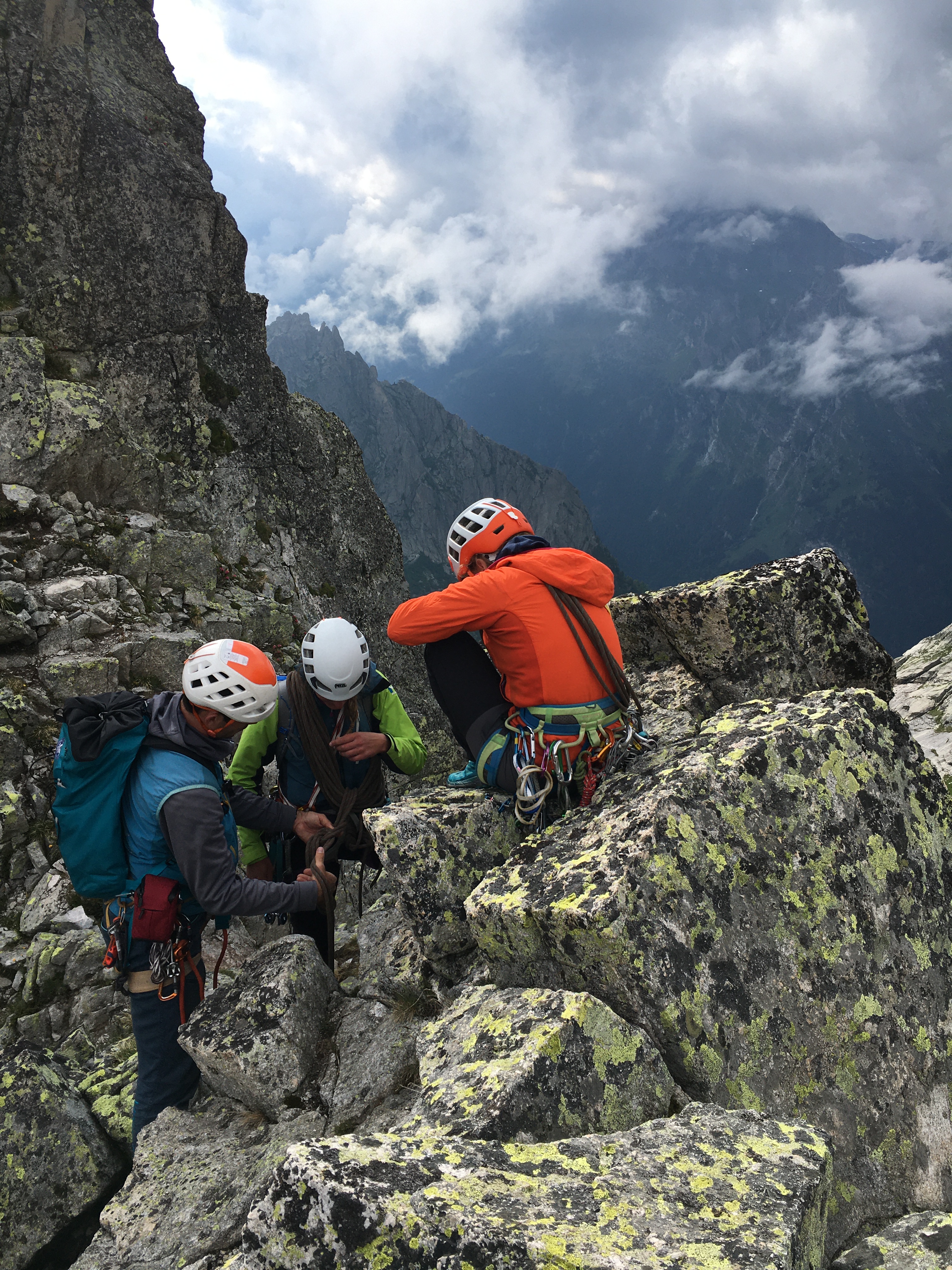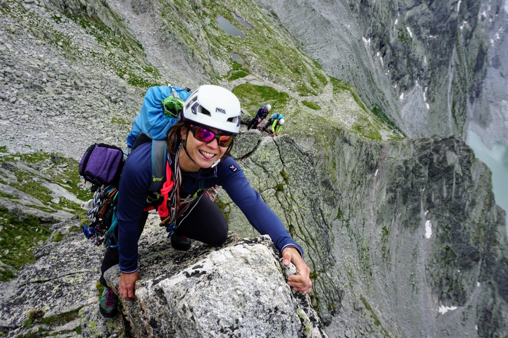 C’est parti pour la mise en pratique sur l’arête S du Piz Balzet. Nos guides Seb et Max nous laissent tout gérer, c’est à nous de choisir les cordées, le matériel et le type d’encordement. On attaque donc à 4 cordées de 2 et Max en électron libre. La thématique de la journée sera l’efficacité : dans la grimpe et la pose de protections, aux relais et dans les manips. La course n’est pas très difficile mais très jolie, le rocher est un beau granit solide qui se prête aux jeux proposés par nos guides : relais sur coinceurs, assurage dynamique, utilisation des becquets comme points d’assurage pour économiser la pose de protections et gagner du temps…