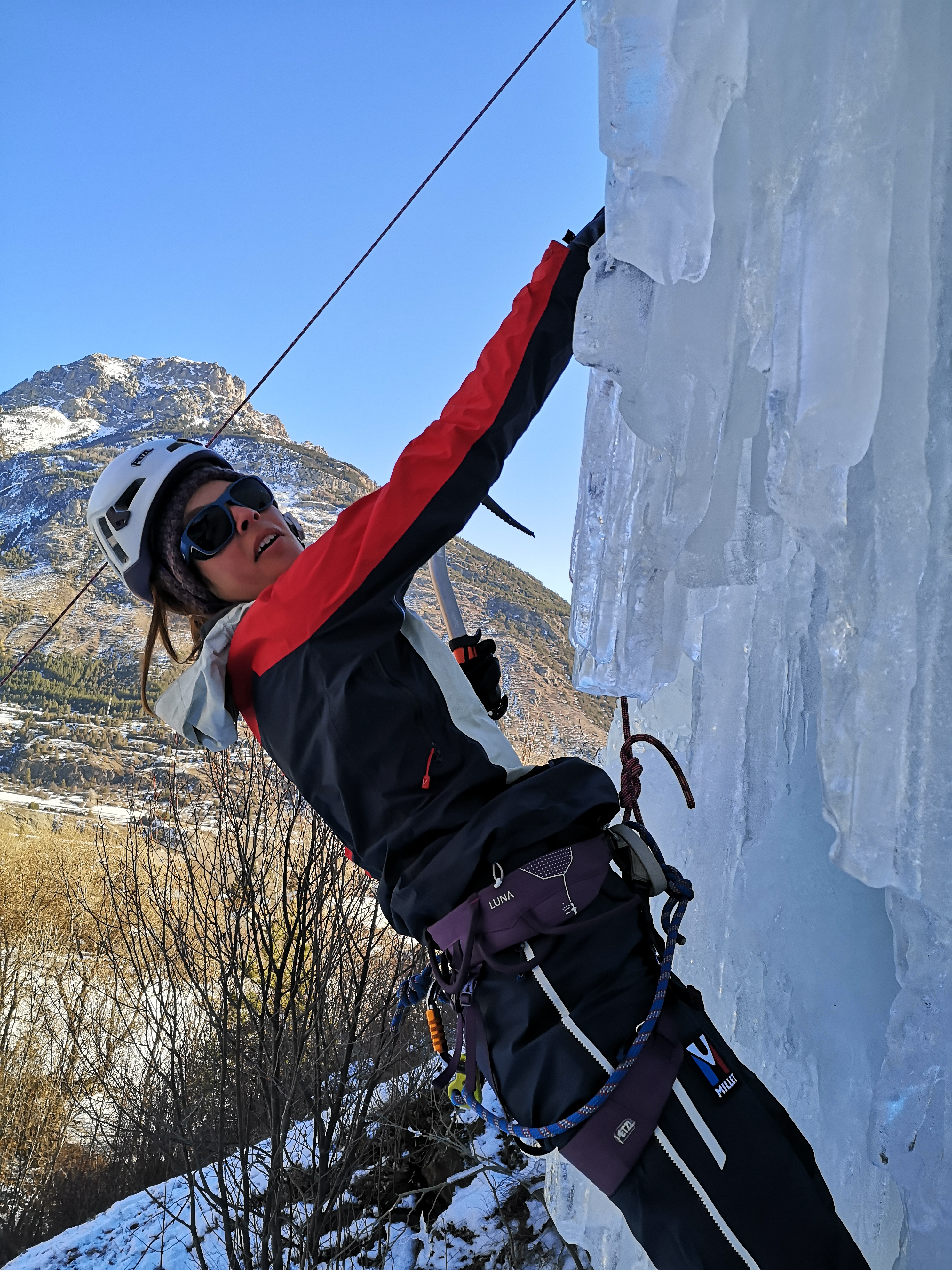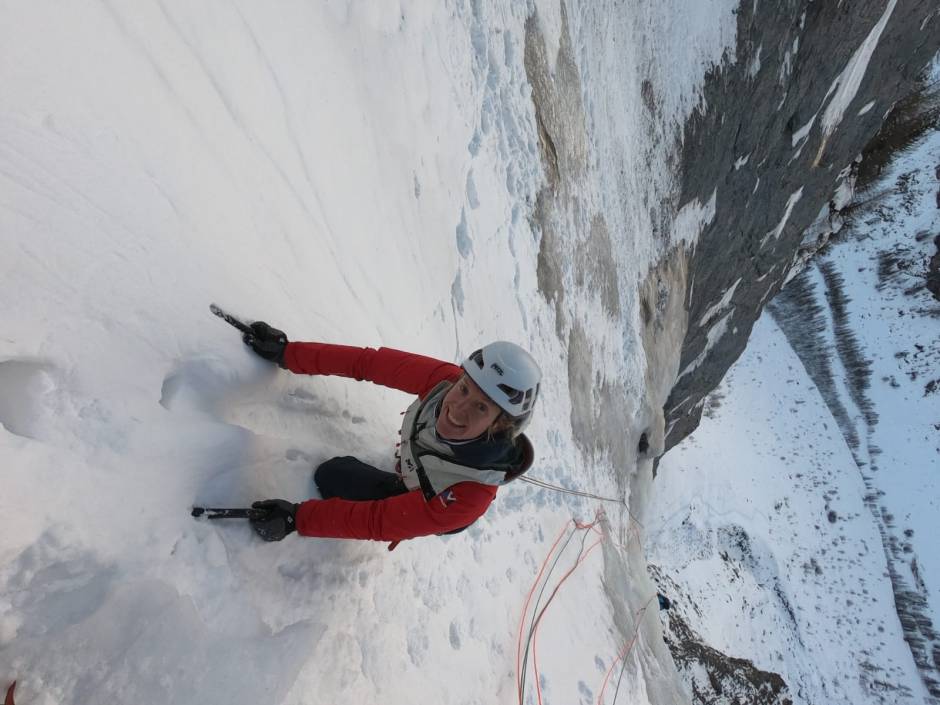 Le beau temps est de la partie et encore une fois nous nous caillons les miches en regardant les rayons de soleil lézarder de l’autre côté de la vallée. La glace, c’est beau, c’est esthétique, c’est sensationnel mais celà n’aide définitivement pas à travailler les traces de bronzage. Heureusement, la marche d’approche réchauffe l’ambiance et les cordées sont au taquet pour attaquer la voie. Cycy et Elo seront avec Pierrick alors que Täte et Chacha, aventurières, se lancent en cordée autonome. C’est d’ailleurs avec brio que Täte avale la première longueur avec un passage vertical qui laisse quand même place à l’hésitation. Il va falloir se sortir les doigts aujourd’hui !