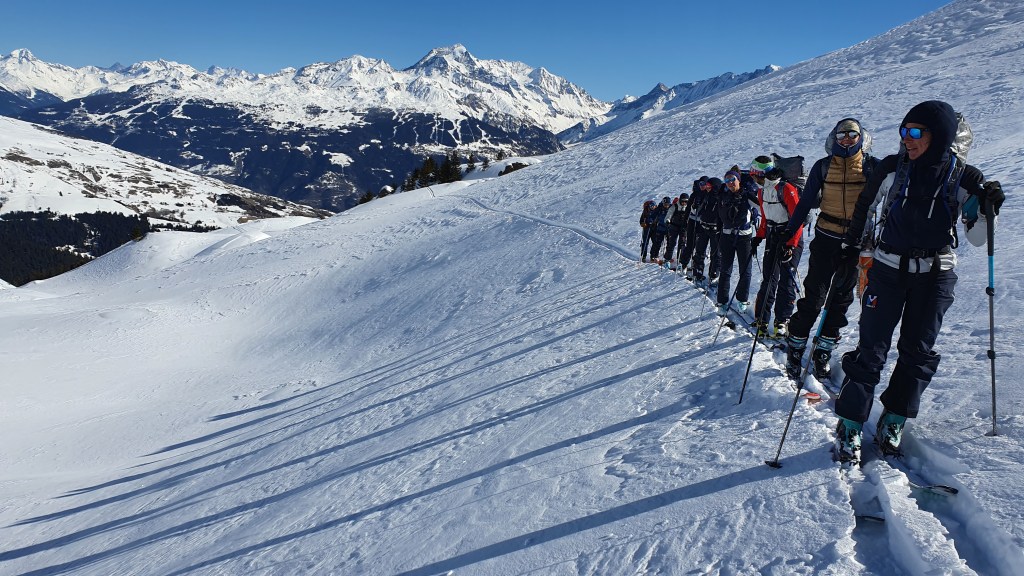Commencer la journée avec une descente, c’est bien ça! Les “check” DVA, sont efficaces, ça ne traîne plus ! Une première descente pour chauffer les cuisses et puis c’est parti pour la montée du jour. On monte le couloir E du Roc de la Charbonnière, la neige commence à se transformer, les crampons ne sont pas nécessaires et la montée du couloir est plutôt facile.