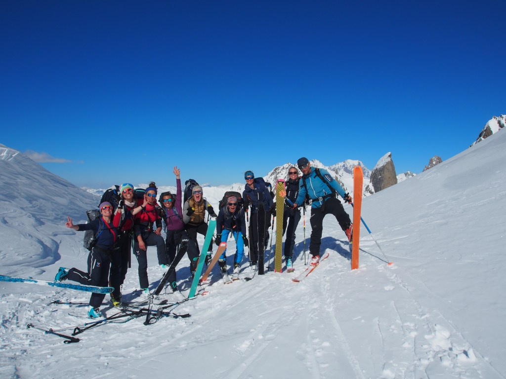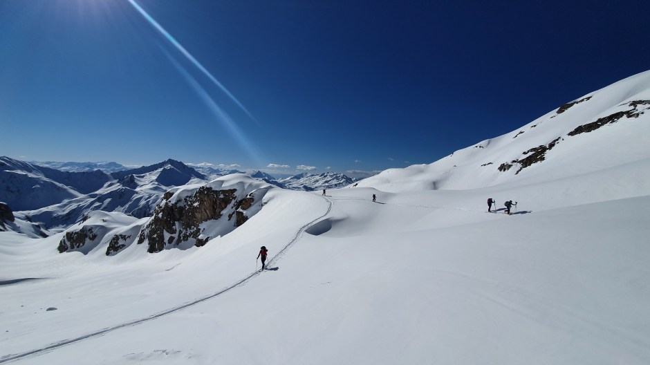 La première montée est longue. On fait toute la trace, on est seules et les pentes sont vierges. Le soleil commence à chauffer, mais on avance: on est plus à l’aise avec la gestion du groupe et la trace est efficace. L’objectif de trouver des pentes avec de la bonne neige est plutôt acquis ! On a tracé toute la descente avec une neige formidable !!!