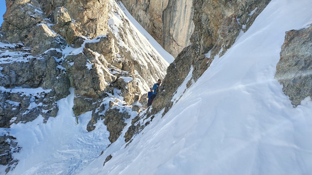 Il est 15h. Pente Sud. Premiers doutes: “je ne suis pas sûre si c’est la bonne heure de passer par là… “Il y a des boulettes à droite… ”Seb a toujours les bonnes réponses. “C’est encore de la croûte, la neige n’est pas transformée ! «