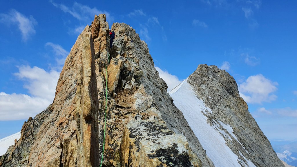 On se lève à 3h pour un départ à 4. Le glacier des Étançons est quasi inexistant, la brèche de la Meije archi-sèche, ça passe bien à la montée mais la descente est un peu plus complexe. On choisit de descendre en rappel, en utilisant un rappel intermédiaire un peu douteux pour franchir la large rimaye. Le cheminement sur le glacier de la Meije est un poil plus long que prévu du fait des crevasses, on repère facilement la croupe de neige à 40° à gravir et on rejoint le pied de l’arête. L’itinéraire est simple et la traversée se déroule vite et bien, dans la bonne humeur et au soleil ! La course est très belle, longue, esthétique, en terrains variés, et la vue sur la Meije est magnifique !