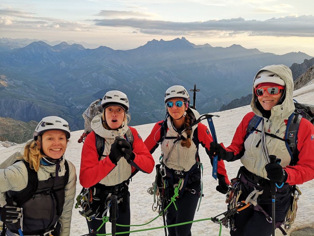 Nous voilà réunies toutes les 8 pour un nouveau week-end de formation. Ça faisait longtemps, car les derniers week-ends ont été en sous-groupes de 4. On est donc trop contentes ! Au programme du week-end, l’arête NE du râteau E dans les écrins, avec montée au refuge du Promontoire la veille par la Bérarde, et descente par le Vallon de la Selle. Rien que d’y penser on a déjà mal aux jambes !!!