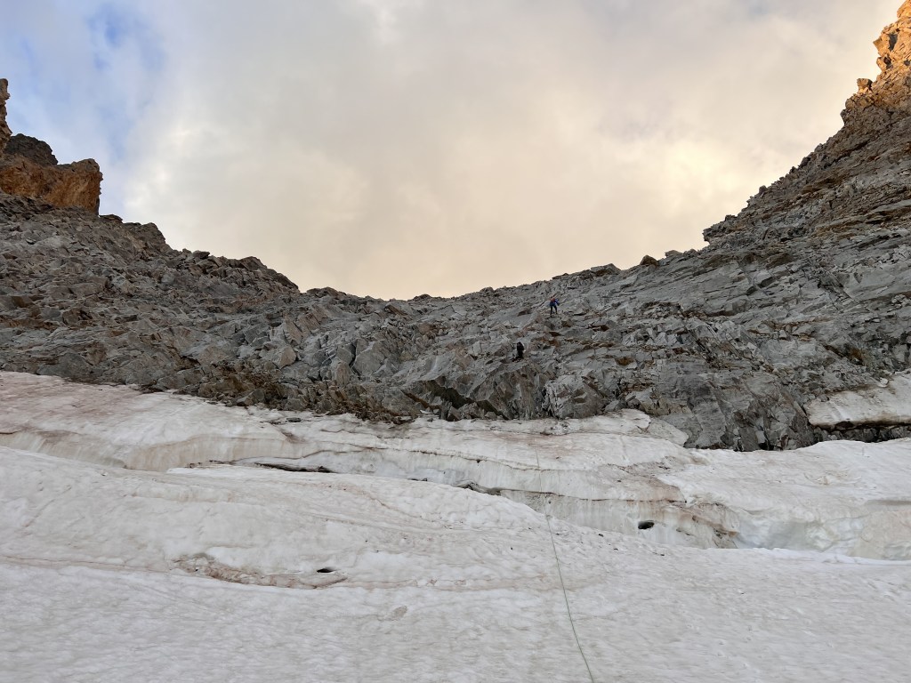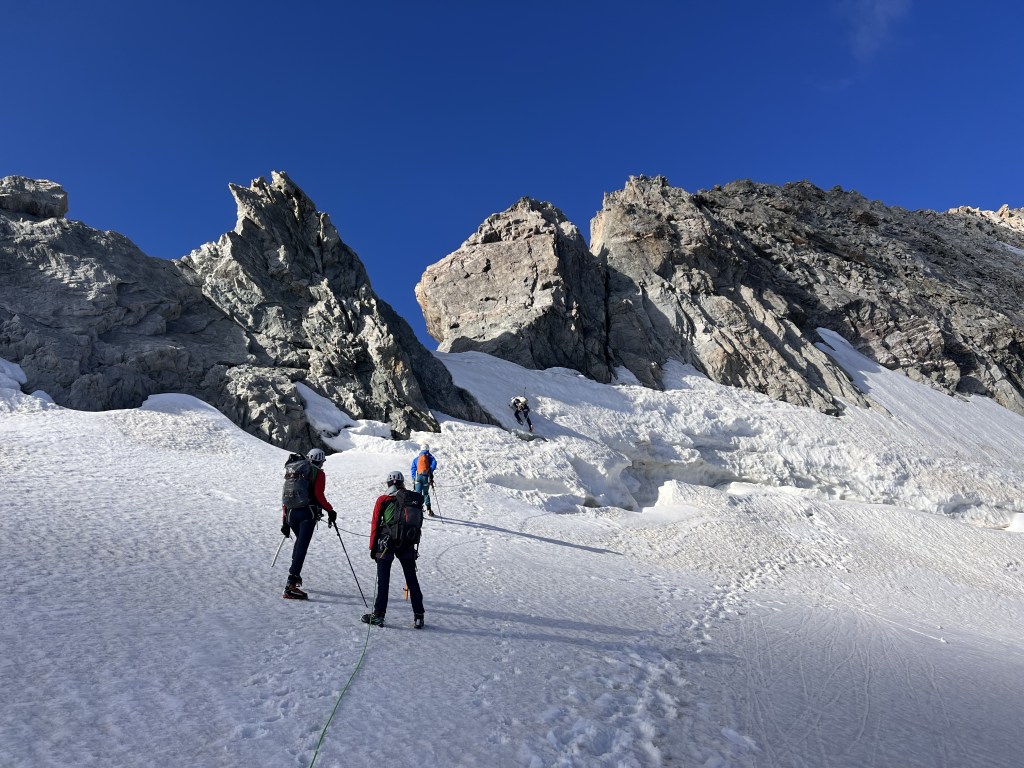 Les objectifs sont triples : 1) retour dans l’élément et dans le groupe (et oui, les sorties à 8, c’est tout un art !), 2) nuit et acclimatation à plus de 3000m en vue du week-end grande course qui arrive 15 jours après, 3) révision / application de nos acquis durant cette première année de formation : terrains variés rocher-glace-neige et encordements variés.