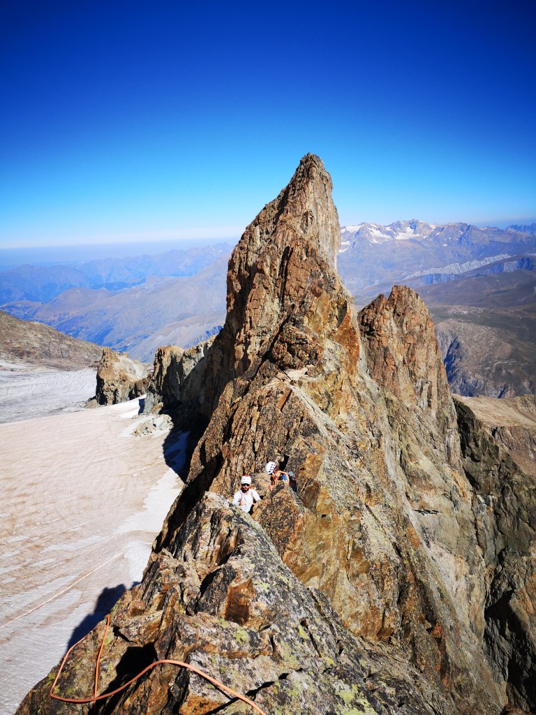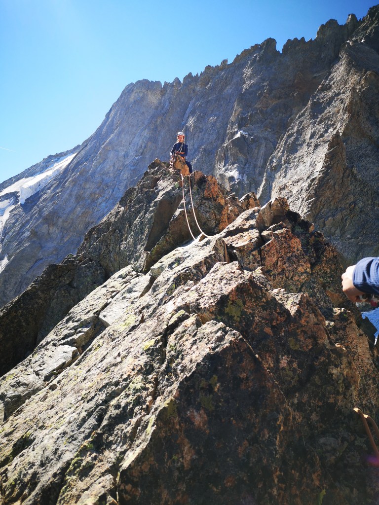 J1 : On se trouve à 7h30 au départ du télécabine de la Grave. L’objectif de la journée c’est faire un “échauffement”avant la Meije sur l’Arête des Trifides. Une arête avec une petite marche d’approche, mais très esthétique et aérienne. L’évolution depuis l’année dernière est remarquable. On est plus efficaces et on avance bien. Max est confiant pour la Meije !