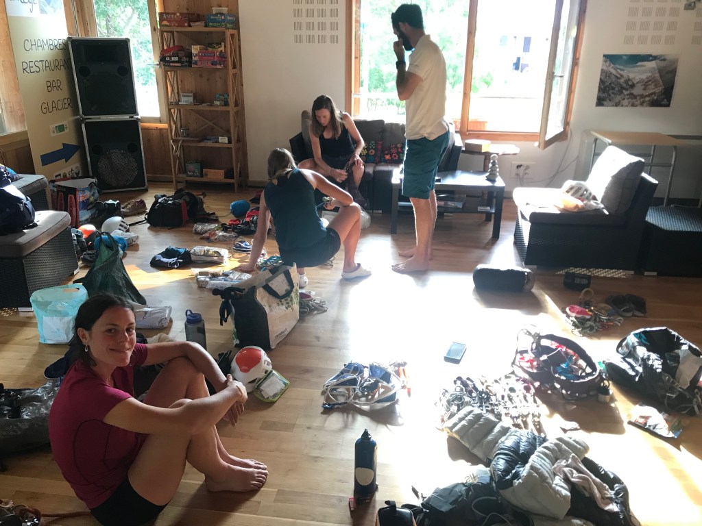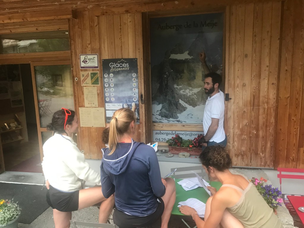 Descente à la Grave, puis on prend la route direction la Bérarde. On commence à être des locaux dans ce coin. C’est l’heure de faire les sacs. Objectif: faire la traversée avec des sacs de maximum 5 kg. Donc faut faire un bon tri de matos! Mousquetons légers, piolet léger, gourdes plutôt en plastique et éviter les métalliques… ça prend du temps tout ça ! Pendant le dîner, on rediscute du topo. On connaît tous les pas par cœur: mur du Crapaud, Pyramide Duhamel, Dalle des Autrichiens…Mais même comme ça, de nuit ça sera facile de se perdre…