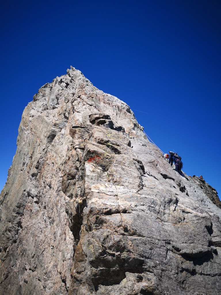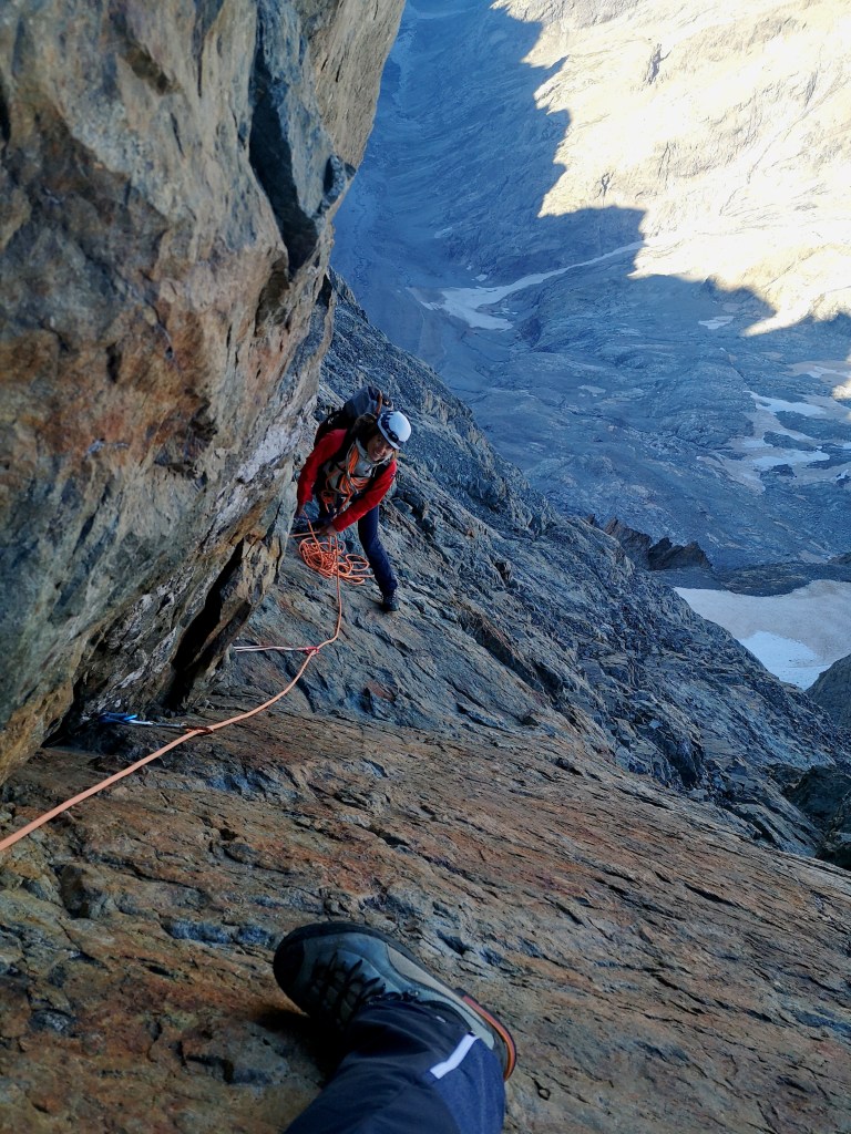 On y sera 4h après au Doigt de Dieu. La traversée des arêtes est parfaite. Des conditions de rêve, avec tout ce qu’on aime : du gaz, des passages en glace, la grimpe n’est jamais dure.