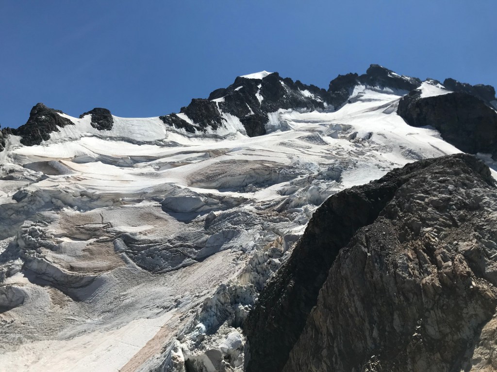 On voit le refuge de l’Aigle, il est tout petit depuis là-haut ! On y arrive vers 15h30. On reprend de l’énergie avec un bon déjeuner. Pause de 1h avant de continuer l’interminable descente. La Glacier du Tabuchet est bien crevassé. C’est plus galère que prévu cette descente. Finalement, on retrouve le sentier. On essaye d’avancer au plus vite, même si on commence à sentir nos cuisses bien fatiguées.