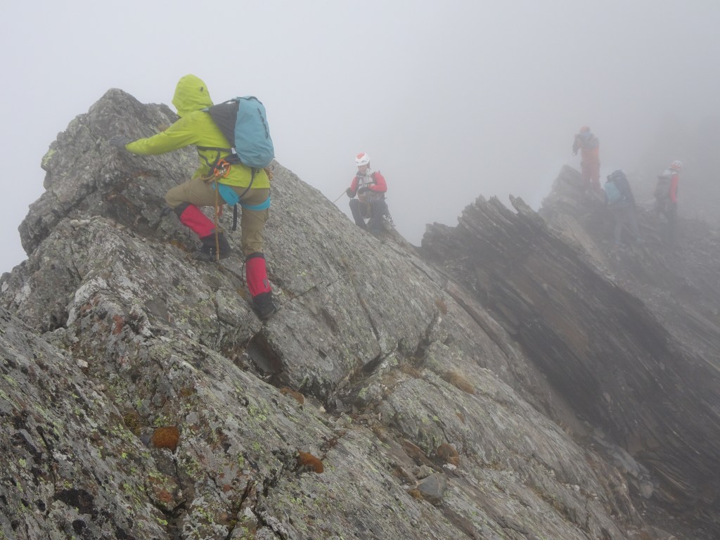 L’ensemble de l’arête se parcourra avec un encordement en corde tendue très court ou l’usage des « mini longueurs », technique encouragée par Sébastien et Christophe. Ça déroule bien, l’arrête n’est pas très technique mais offre un terrain idéal pour le gros groupe que nous sommes et les conditions presque hivernales. Nous nous arrêterons à l’antécime car le cailloux est de plus en plus délité et il commence à y avoir de la neige.