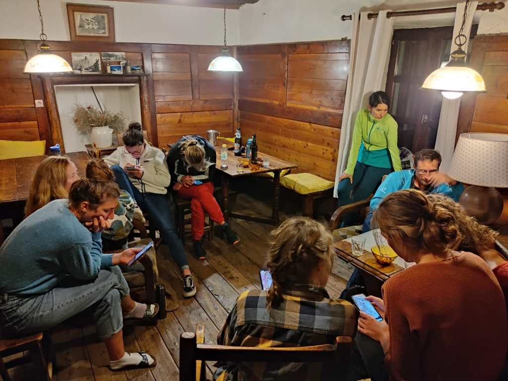 Nous réfléchissons au choix du lieu pour les ateliers et la petite course d’application. Nous optons pour des ateliers par groupes fixes et déterminons les différents thèmes et le timing. La météo annoncée n’étant pas terrible, nous choisissons une arête proche de notre logement et peu technique pour éviter l’inertie et nous permettre de nous concentrer sur la partie formation pour nos chatons.