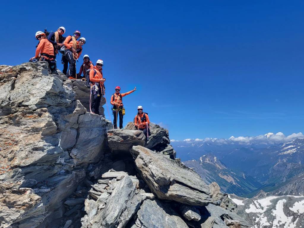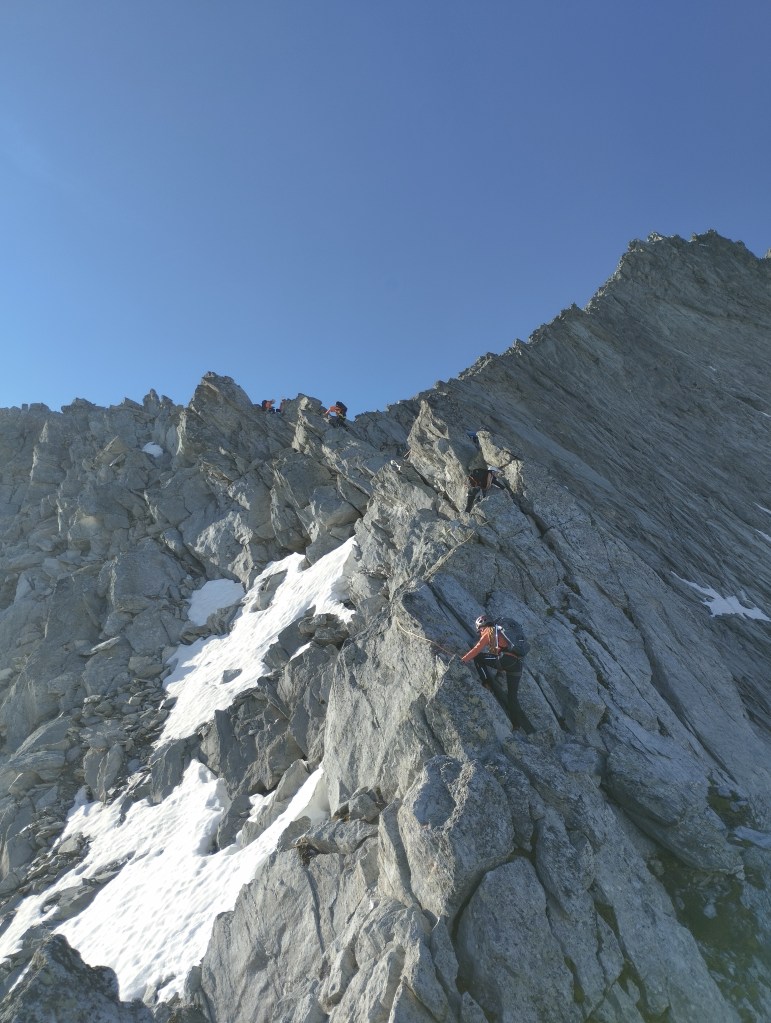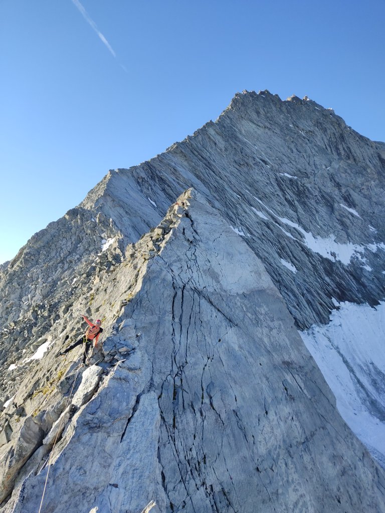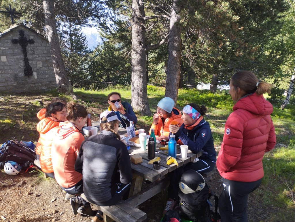 Bilan : on a un bon niveau homogène en rocher, on est en super forme et on a réussi notre test d’endurance pendant ce week end, on adore nos tenues Millet, on adore poser des coinceurs, on n’aime pas les pierres qui bougent, on n’est pas toujours à l’aise quand Seb fait le ménage, on a bien compris qu’à la prochaine arête on va ‘’ rester sur le fiiiiiiiiiil’’, ET on sait descendre en rappel sur demi-cabestan. On se donne rendez-vous en juillet pour de nouvelles aventures alpines, cette fois scindées en 2 groupes. On ne vous dit pas encore où, mais on vous donne quand même un indice : probablement dans un autre pays, qui cultive super bien la raclette et le fendant. En attendant, belles aventures estivales alpines à tous.tes !