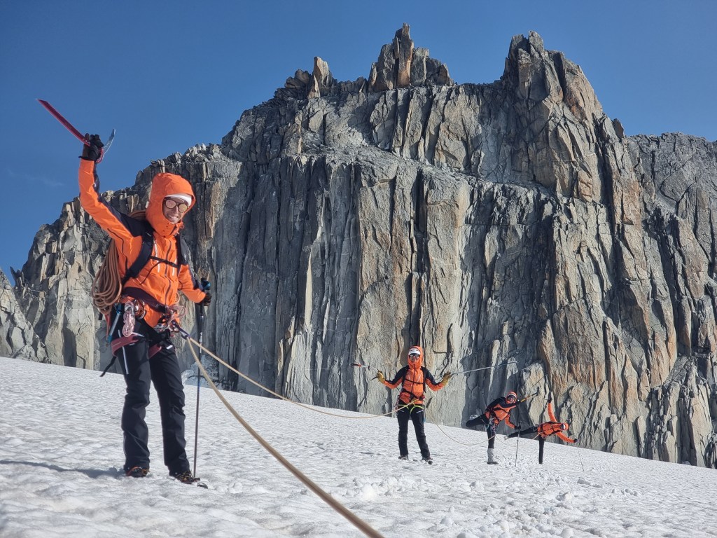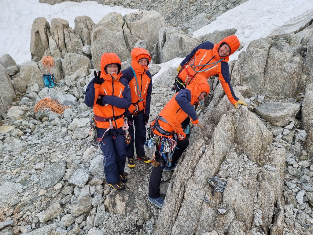 Après une rapide descente sur le Glacier Plateau du Trient, c’est Laura qui prend le lead de notre cordée de cinq direction la brèche à l’est des Aiguilles Dorées. C’est dans une superbe ambiance, entre soleil et nuages que nous traversons le glacier. Nous arrivons au pieds des aiguilles et Laura ouvre le bal dans les premières longueurs de grimpe. Nous sommes impressionnées par la beauté et la propreté du granit. ‘’On dirait que l’on grimpe sur un plan de travail de cuisine !’, lance l’une d’entre nous.