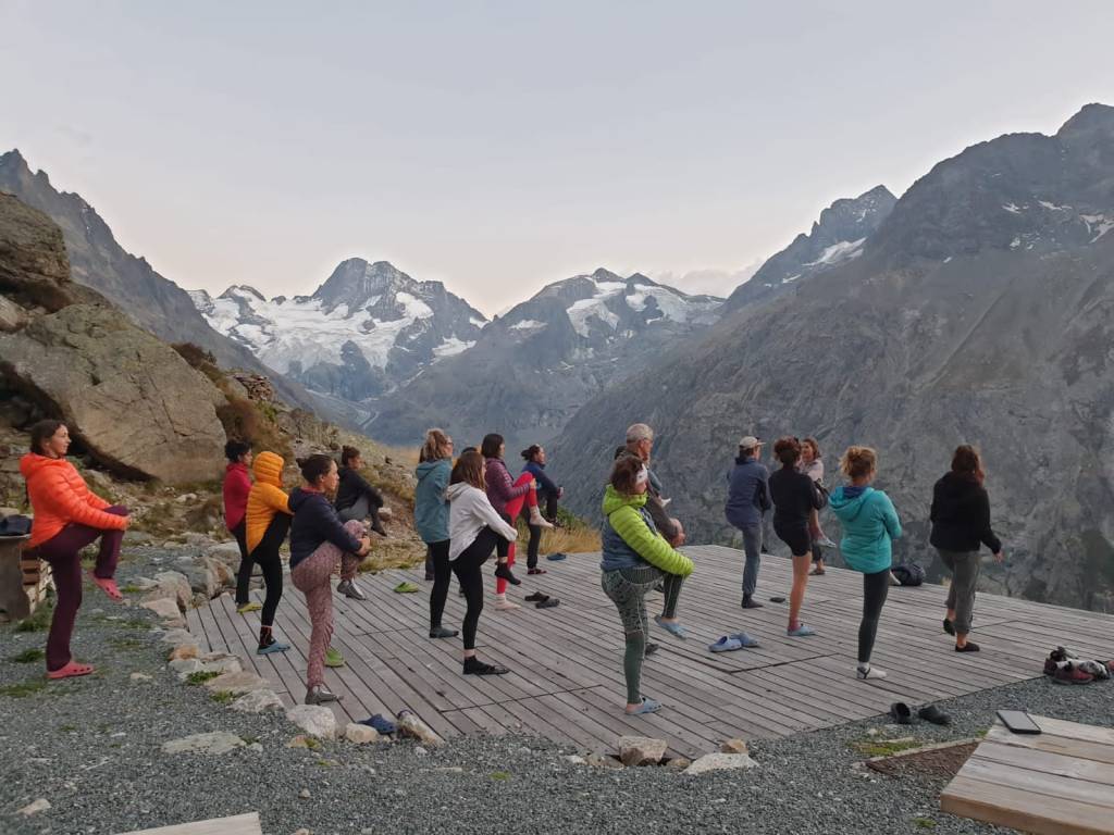 Après la troisième longueur nous devons “déjà” redescendre car un beau projet nous attend pour la suite du week-end. Nous enchaînons ainsi par la montée au refuge Temple Ecrin. Après un bon repas, Aude notre experte en Yoga (décidément il y a toujours une Maître Yogi dans les groupes d’alpi 😉 ), nous fera une petite session au coucher du soleil… Encore un grand moment !