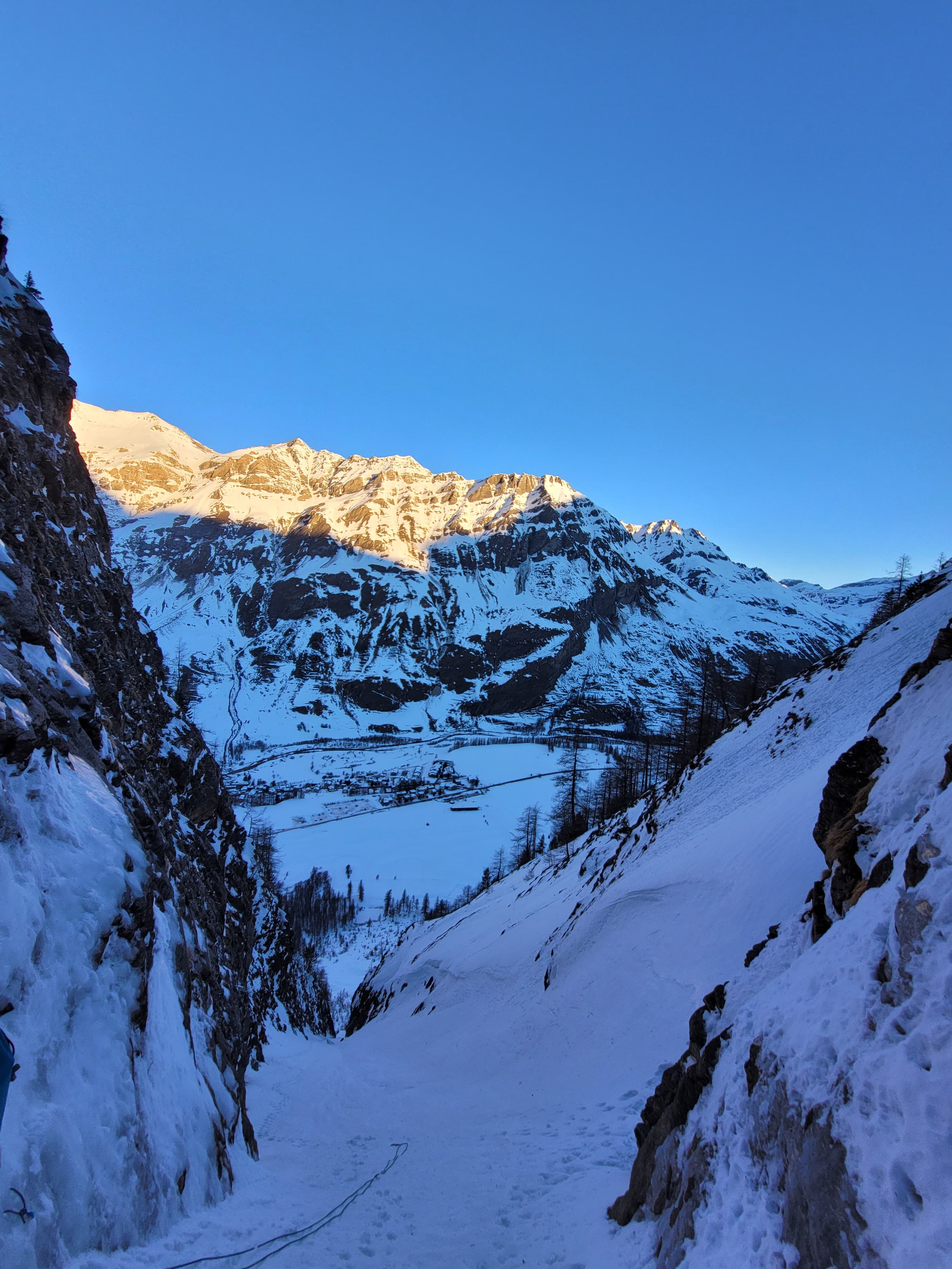 Max ne nous avait pas menti, les conditions sont démentes. On enchaîne longueur de glace et couloir de neige le sourire aux lèvres. Chaque longueur est incroyable, le paysage est magnifique, le temps est parfait, pas de peur que du bonheur.