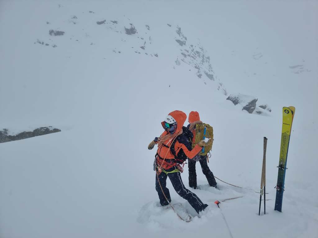 Le glacier est bien bouché, et connu pour être très peu crevassé à cet endroit, pas besoin de s’encorder. Par contre, arrivées au pied de la moraine, il faut faire attention aux chutes de blocs de pierre bien visibles qui tombent régulièrement. On met les skis sur le sac pour passer les 50m raides à pied. On rechausse les skis, direction le col. Plus on monte, plus le vent devient fort. Arrivées au pied du couloir, on met nos crampons, 1 piolet chacune, 1 bâton en complément pour les deuxièmes de cordées et on s’active, on y est presque. Nous sommes seules dans le couloir. On progresse régulièrement jusqu’à 30/40 m sous le col. Max nous donne quelques conseils pour bien rester collées à la pente et ne pas se faire souffler. On fait quelques arrêts quand les bourrasques sont trop fortes et on gagne le plus de terrain possible pendant les courtes accalmies. Arrivées sous le col, Max nous demande d’attendre. Au top départ, on passe d’un seul élan le col pour descendre s’abriter derrière un rocher de l’autre côté. Il est 12h30, les rafales sont à 110/120 km, l’objectif d’être en haut avant 13h est atteint mais il ne faut pas traîner, la tempête continue de se former. Impossible de chausser les skis ici, on descend à pied quelques dizaines de mètres. Le vent nous offre un répit confortable pour remettre nos skis et attaquer la descente.