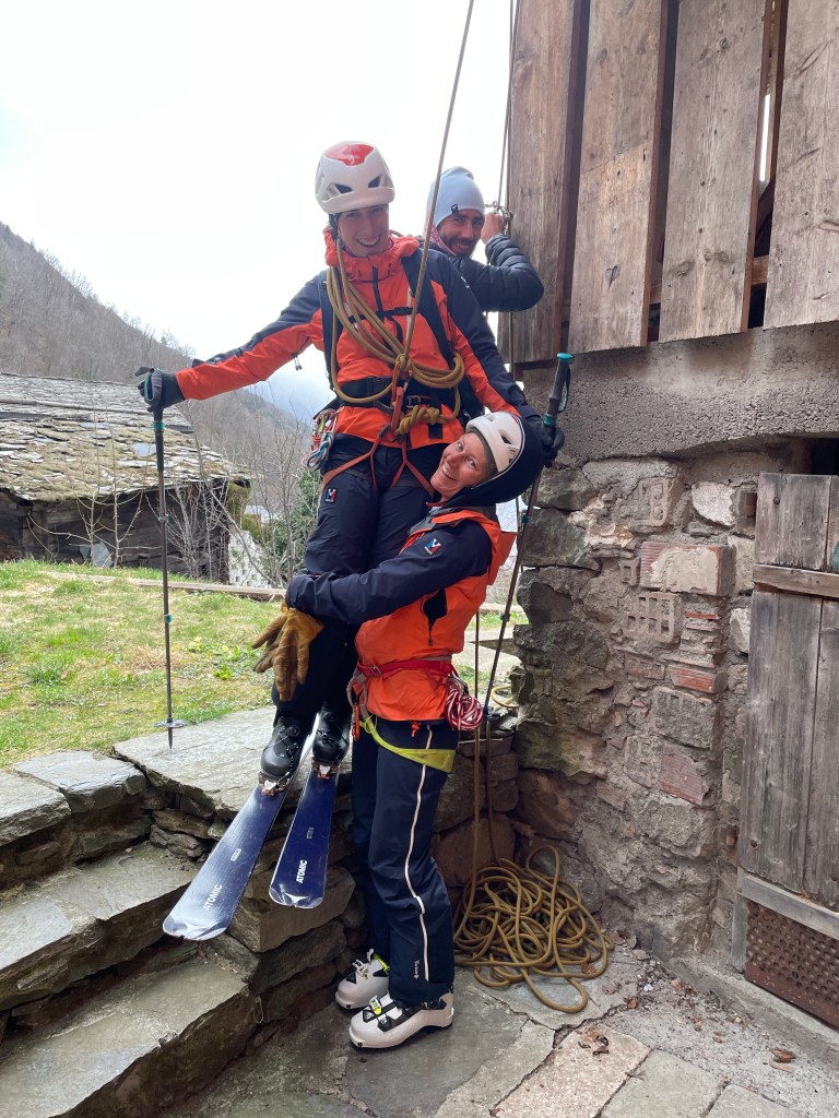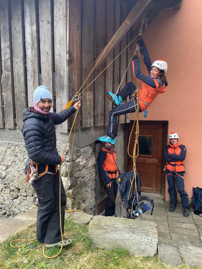Dimanche on démarre par des exercices pratiques, on a repéré la veille le spot idéal, adapté à l’exercice, à… 4 mètres de la porte d’entrée d’Oriane. Une belle poutre au-dessus du vide avec un petit muret pour se suspendre. L’objectif est de faire une remontée sur corde toutes équipées avec skis, sacs lourds, moufles, doudounes, casques, anneaux de buste etc.