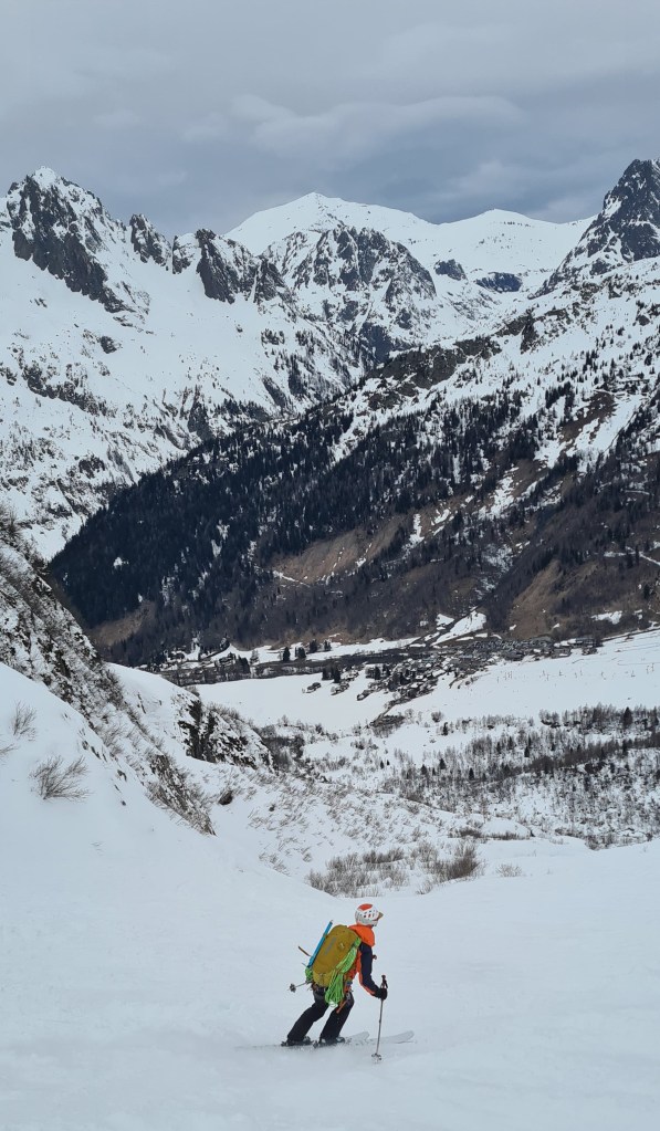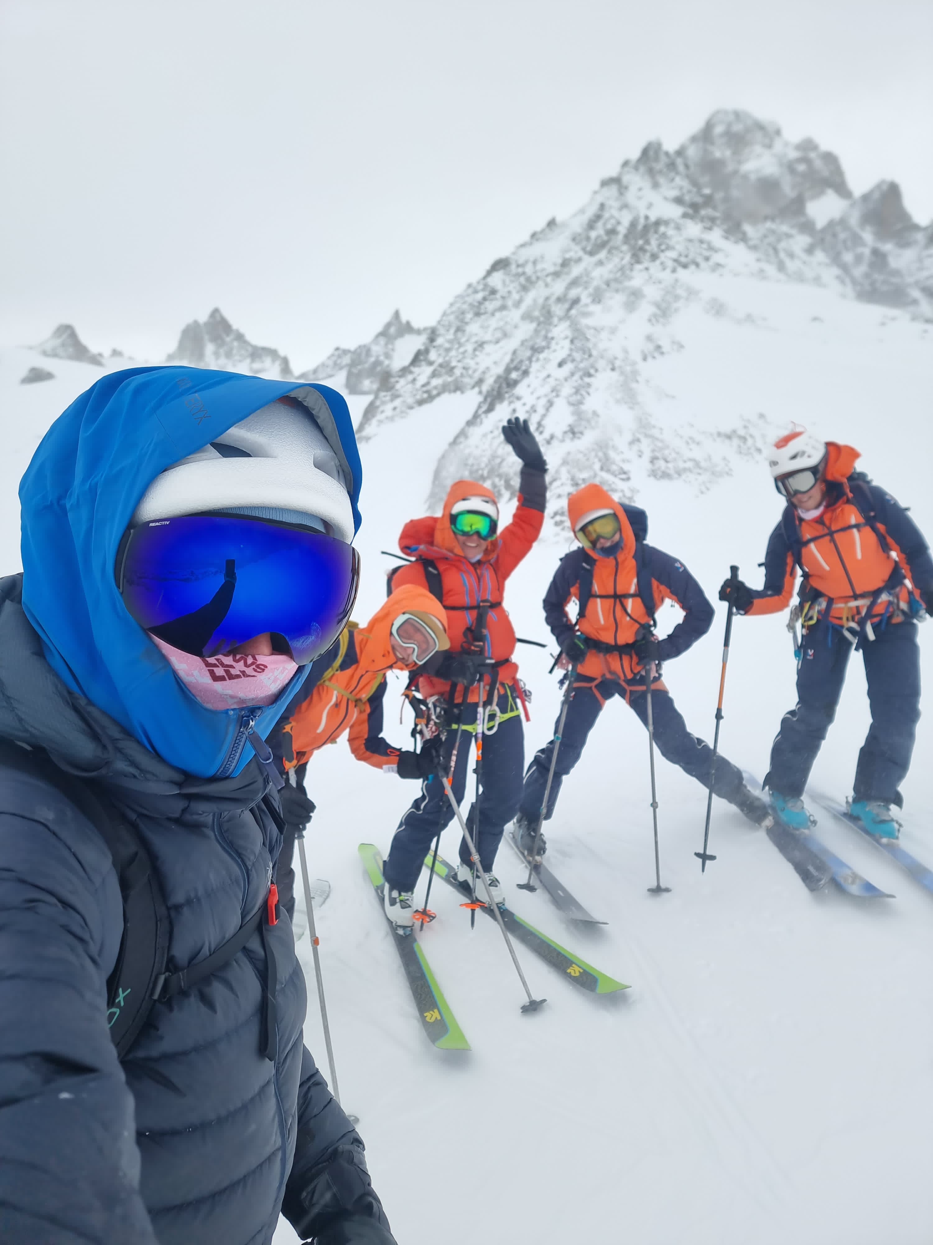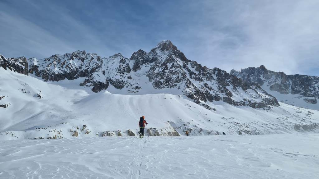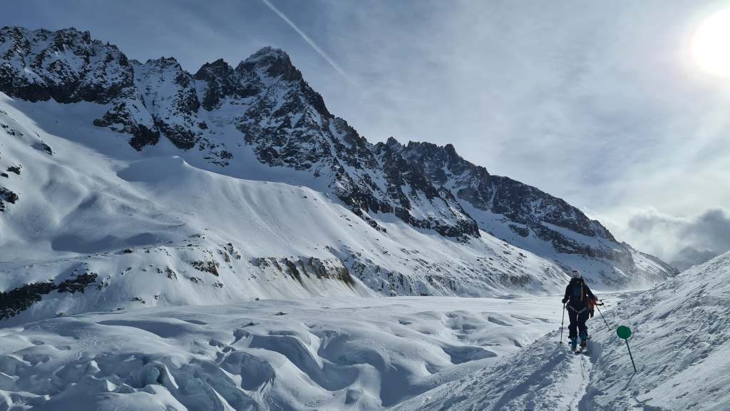 On se retrouve toutes le samedi matin aux Grands Montets. Direction le glacier d’Argentière, il n’y a pas une minute à perdre si on veut passer le col à temps. On choisit l’option la plus courte pour atteindre le glacier en descendant directement vers la cabane de Lognan plutôt que de basculer par le col des Rachasses. Vers 2300, on re-peaute en direction du glacier d’Argentière. À la bascule sur le versant, on sent les premières bourrasques de vent. Pile à l’heure prévue ! Pas de temps à perdre, les quelques rayons de soleil matinaux se retirent, les nuages arrivent, on sait que ça ne va faire qu’empirer, le vent est annoncé à 160 km/h là-haut pour le milieu d’après-midi.