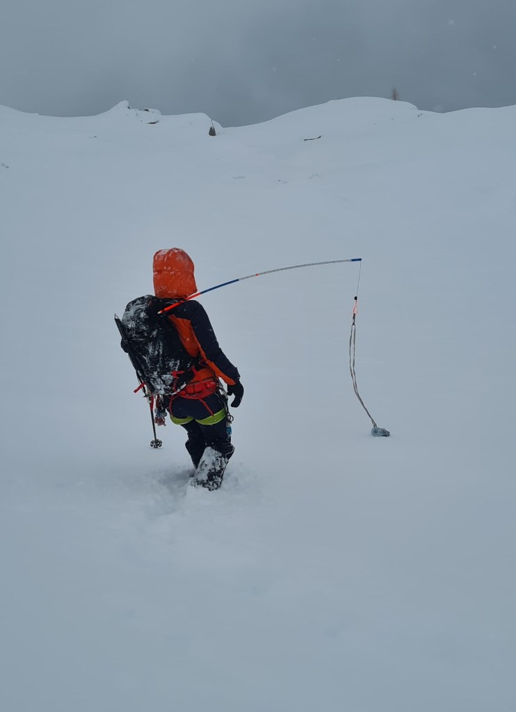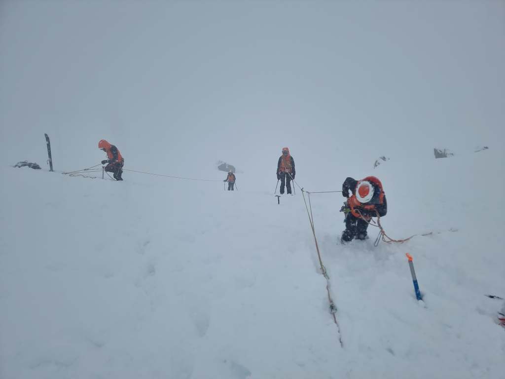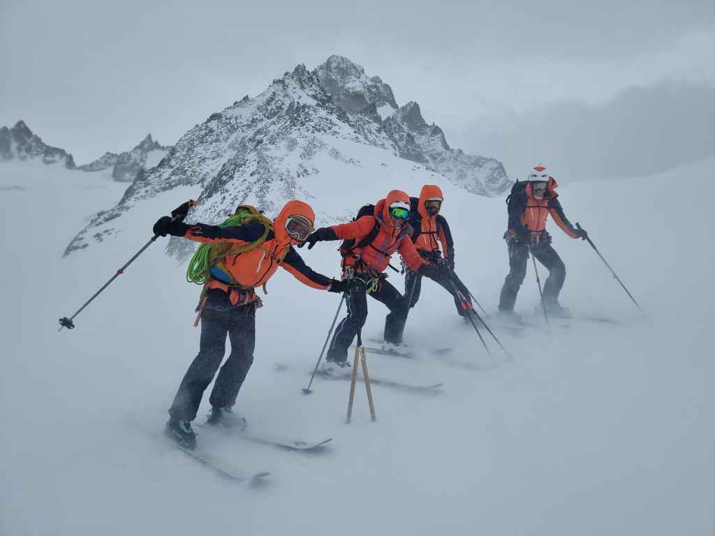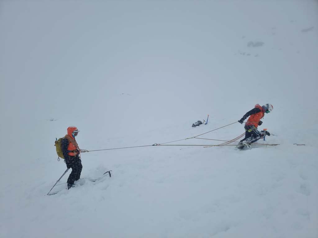En fin de matinée, direction le plan de l’aiguille. La remontée vient juste d’ouvrir. Arrivées là-haut c’est jour blanc / brouillard. Parfait ! C’est exactement ce qu’on avait prévu. On commence par apprendre à se repérer dans le brouillard. Avancer encordées au milieu des crevasses quand on ne voit pas à 3 m. On teste la technique du lasso de sangles et celle de la sonde lestée. Marion et Estelle décident de mixer les deux pour un résultat optimal, Max valide l’idée, on vient de transcender nos capacités à nous repérer dans le brouillard !