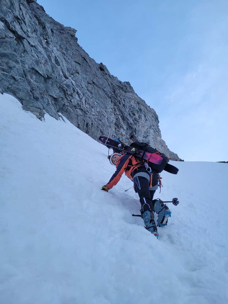 Laura le bulldozer, nous fait une trace tapis rouge jusqu’au col, puis Seb nous apprend comment descendre une corniche avec une main courante… sur corps vivant.
