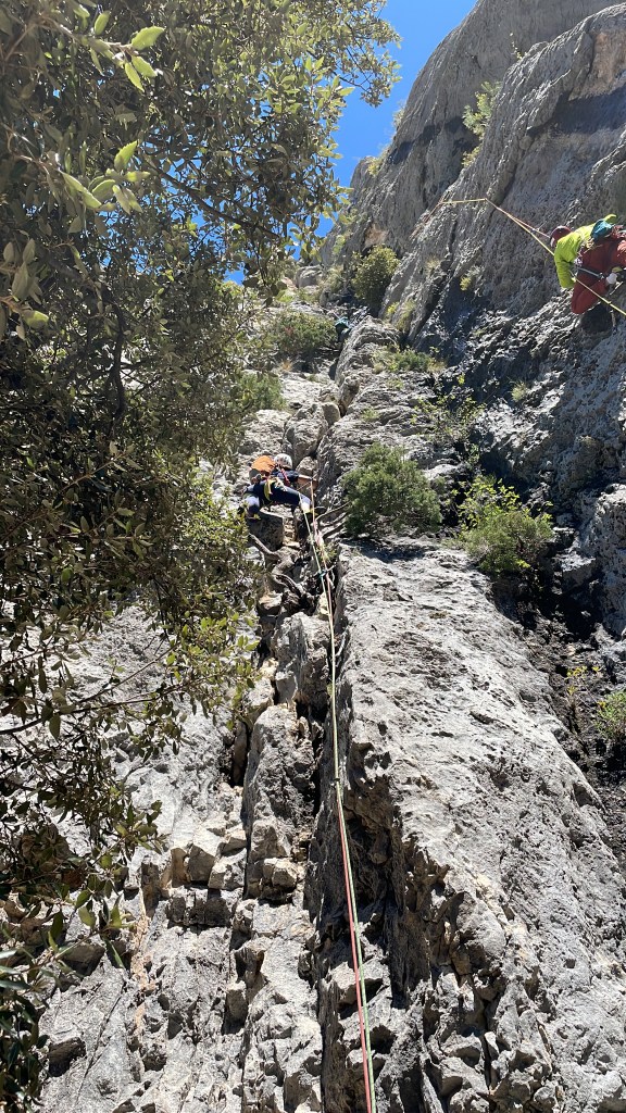 4ème et dernier jour, on n’aura pas vu le temps passer! On décide de se faire cette journée dans le même secteur, pour profiter de nos derniers instants ensemble. Karine, Marion B, Marjo et Marion RS feront deux cordées dans “Adieu Zidane” tandis qu’Oriane et Laura se lanceront dans “Hissage nocturne” (secteur Galetas). Après 3 rappels effectués à vive allure par nous 6 (eh oui, c’est ça aussi l’esprit d’équipe : “Alors je descends avec les cordes, j’installe le prochain rappel. Ensuite tu me rejoins avec 2 autres cordes et t’installe le dernier”), qui plus est dans une ambiance plus que magique (magnifique rappel en fil d’araignée!), nous nous élançons dans nos voies.