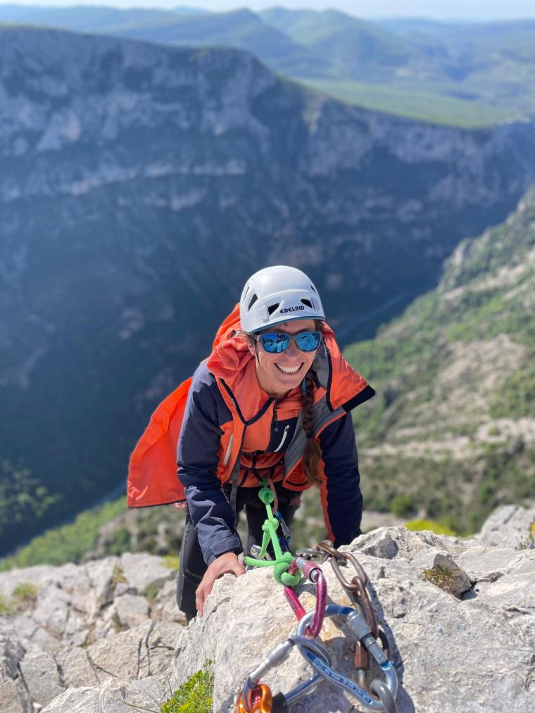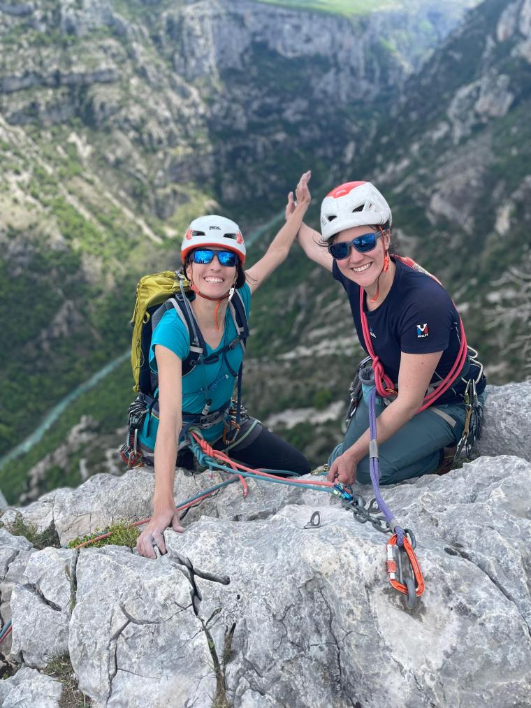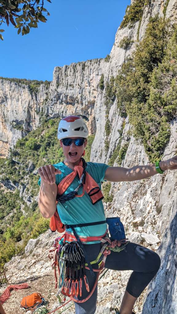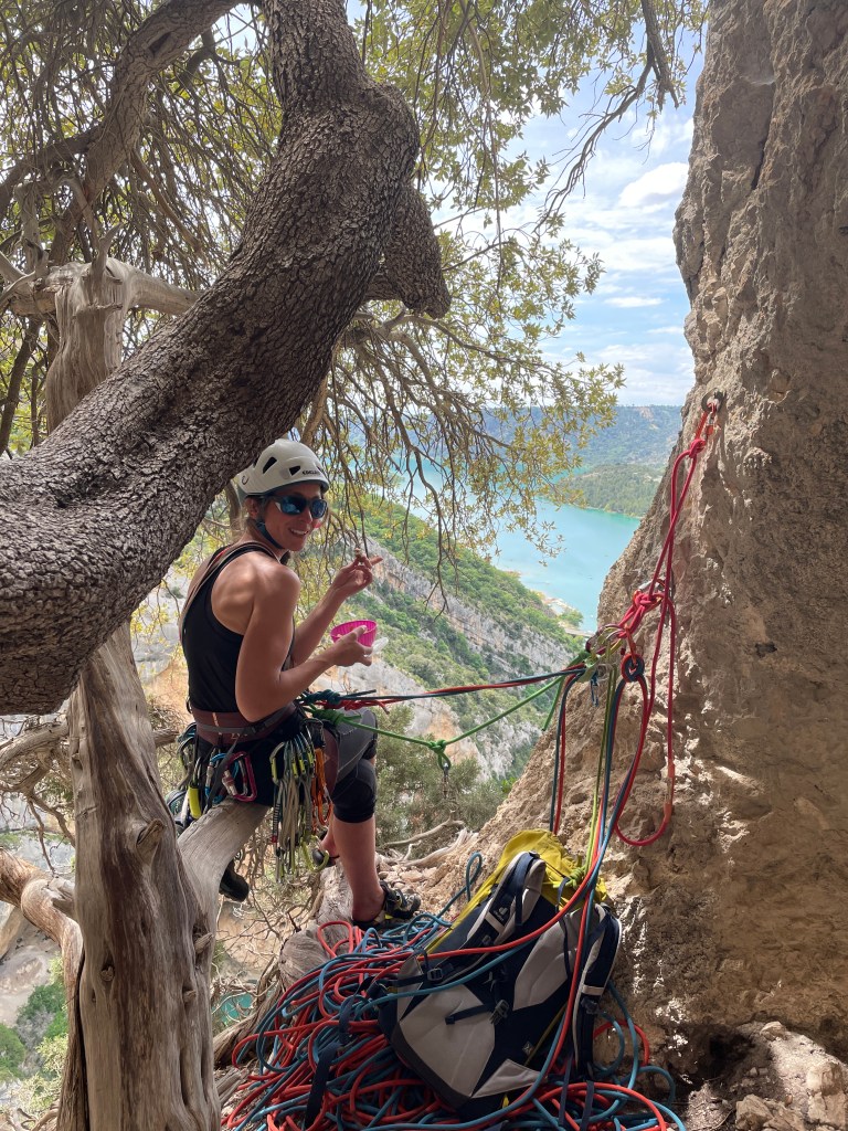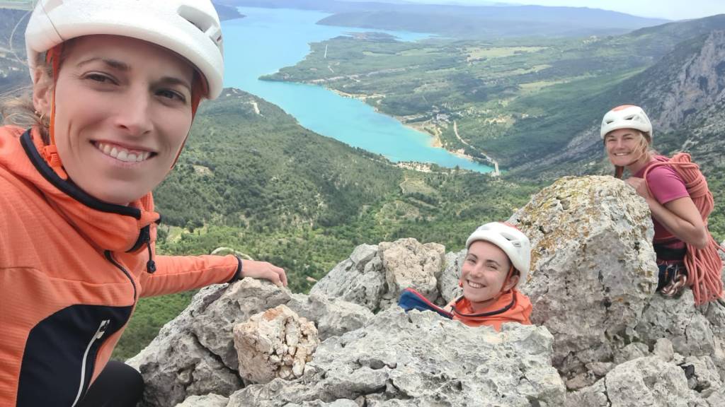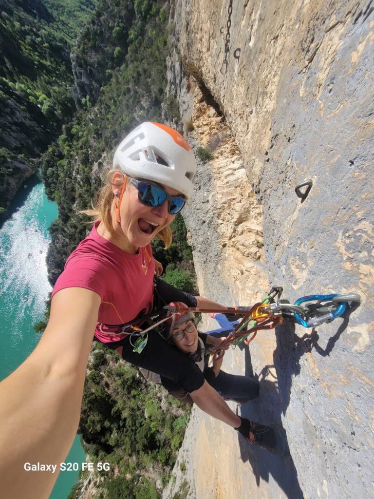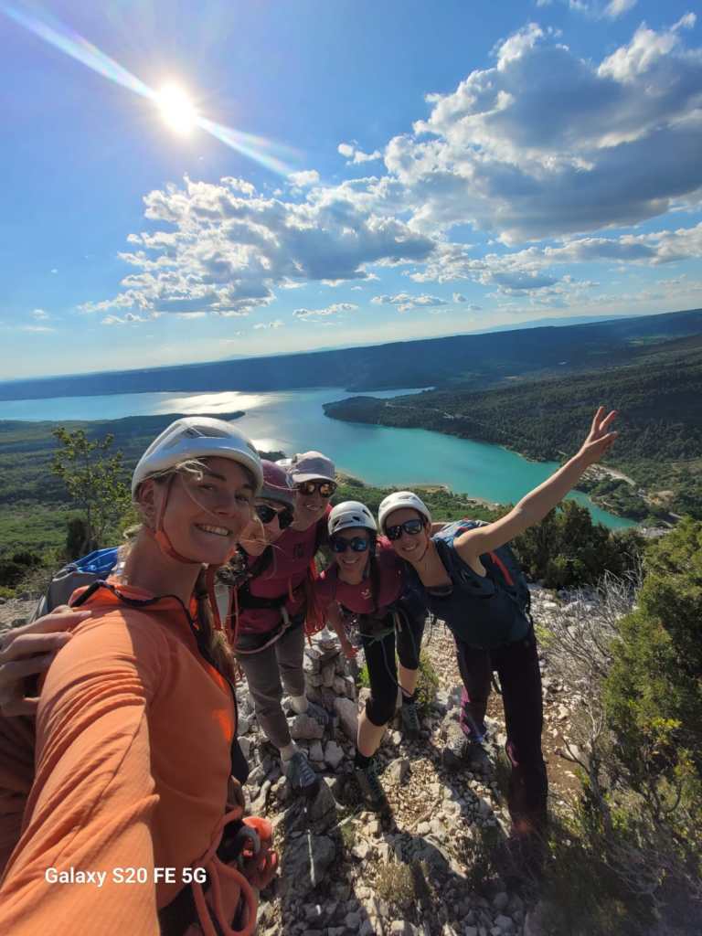 Ça y est, on est toutes arrivées en haut (on avait pas vraiment d’autre choix ceci dit) avec une vue magnifique sur le lac de Sainte Croix et le Verdon. Petite photo proche du bord pour marquer le coup et là aaaaaaaaaaaahhhh!!! crie de terreur d’Oriane… une chenille. Moment le plus flippant de la voie, et probablement le plus expo!