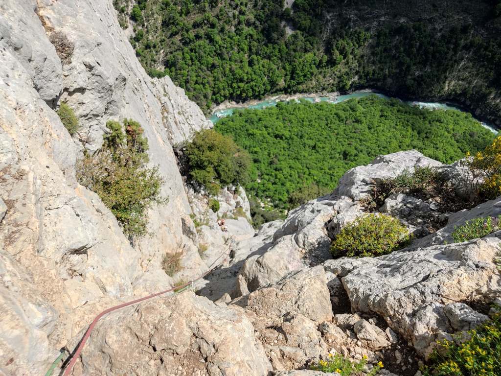De leur côté, les Marion(s) et Séverine partent pour “Chlorochose” dans les falaises de l’Escalès du Verdon. Après à peine 10 min de voiture nous arrivons au belvédère de Carelle. Déjà quelques voitures présentes mais rien d’inquiétant. Au relais par contre 5 cordées sont présentes. Nous descendons en 40 min les 4 relais… et attendons 2h au pied de la voie pour laisser passer les 4 cordées devant nous.