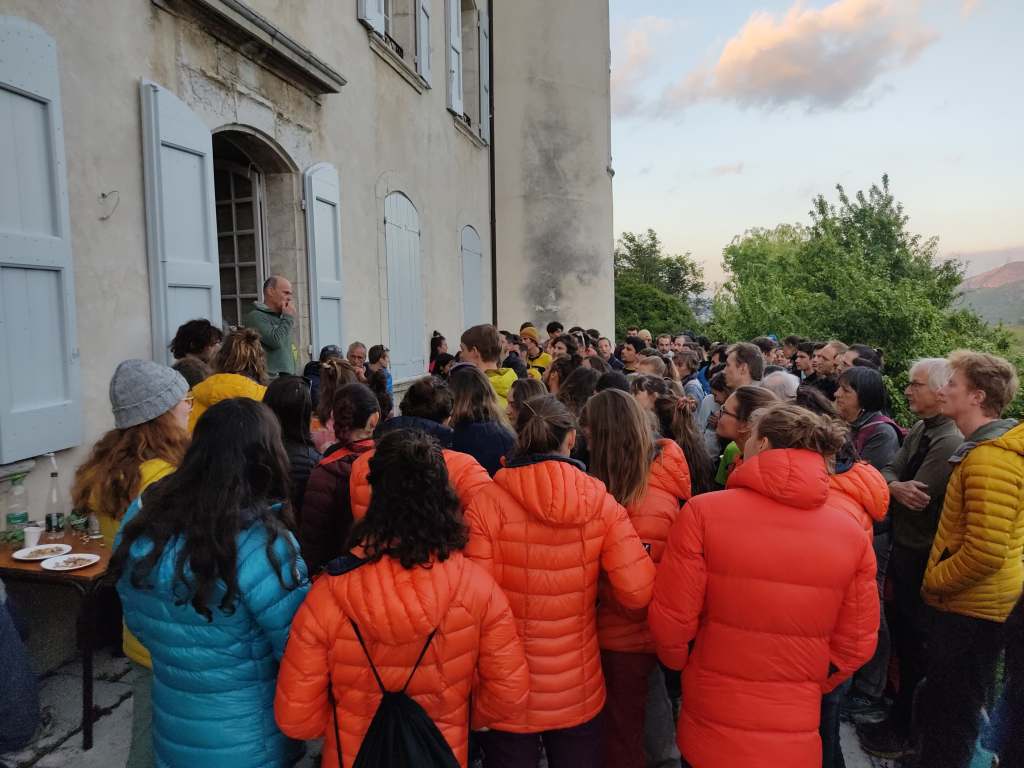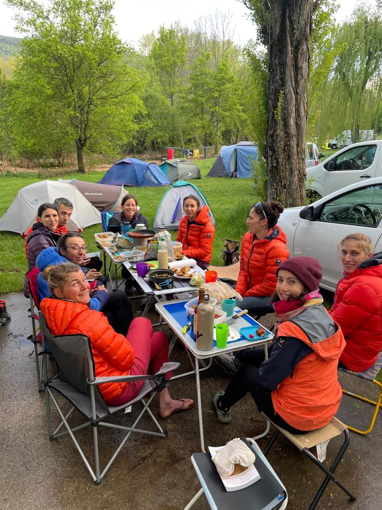La soirée se déroule dans la salle de la Mairie. Tous les groupes sont réunis pour l’apéro. C’est l’occasion de re-croiser quelques têtes aperçues sur les voies et de faire connaissance avec les autres groupes jeunes et groupes féminins. On nous repère bien au milieu des autres avec nos doudounes Millet oranges. On discute avec nos homologues pyrénéenness : l’EPAF (Equipe Pyrénéenne d’Alpinisme Féminine), nos homologues Grand Est : les CAF Girls Grand Est et avec les Tradeuses Occitanes.