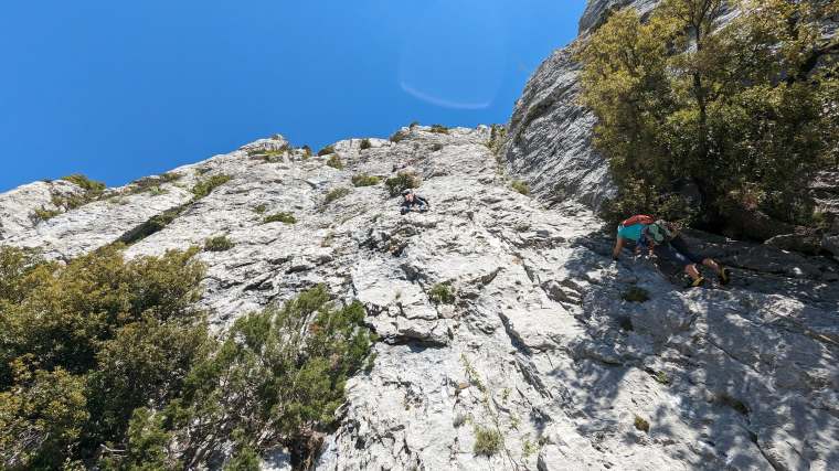 Pas le temps de niaiser, on est dans le Verdon, on veut en profiter : Estelle nous vend “Une pincée de Ketchup”, 10 longueurs, 6c max… parfait pour une reprise “en douceur”. Malgré quelques appréhensions, notamment sur l’équipement, nous seront agréablement surprise par cette magnifique voie, bien équipée, sur un rocher excellent! Les rappels nous mettent directement dans l’ambiance, on avale les longueurs en flèche sous un soleil enfin présent, quel régal ! On grimpe (cool), on rigole (cool), on se fait doubler sur une vire (pas cool), bref, on sent qu’on va passer un séjour de dingue !