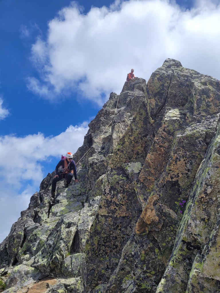 Une fois la pluie passée, direction le col du Glandon : brouillard et grand frais nous accueillent, on hésite, mais après tout, on est pas venues pour rien ! Direction les Petites Aiguilles d’Argentière, on s’oriente dans le brouillard, on compare la carte au terrain, on apprend déjà énormément. Une fois au pied, nous décidons de nous lancer sur la traversée des Aiguilles : cette course est parfaite pour mettre en application tout ce que nous avons pu apprendre depuis 1 an et demi (déjà!!!!!!!!!) : encordement en fonction du type de terrain, pose de protection, gestion de l’itinéraire, tout cela en étant rapide et efficace.