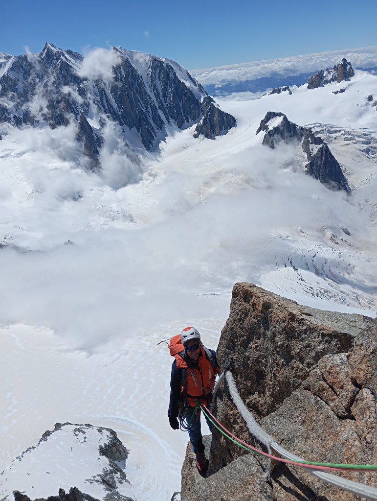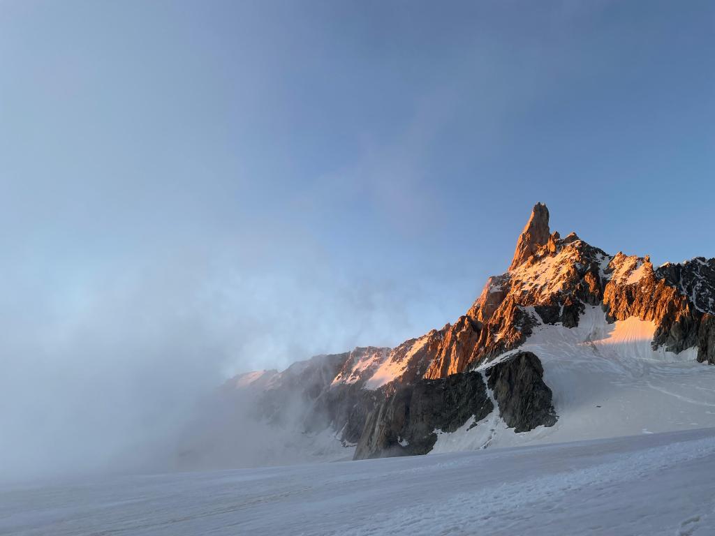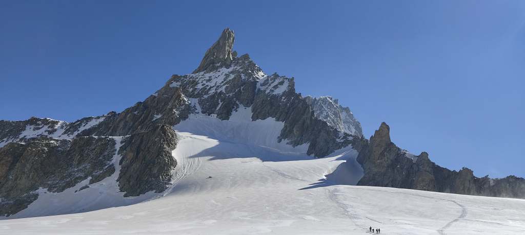 Au réveil, les troupes sont revigorées. Le ciel est bleu comme jamais et le vent est tombé. Après hésitations et aux vues de la fréquentation de la journée, on préfère réviser les manips de secours en crevasses et explorer la vallée blanche, plutôt que de partir sur une autre course. On devine dans l’ombre les cordées sur la Dent du Géant telle une procession.  Pas de doute, nos conditions étaient moins favorables que par une si belle journée d’été, mais on l’aura eu rien que pour nous, et ça c’est vraiment Géant !