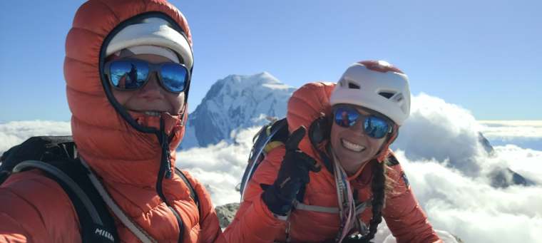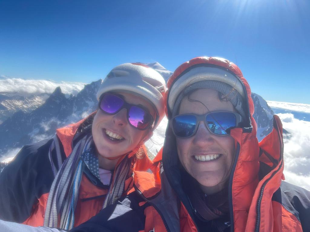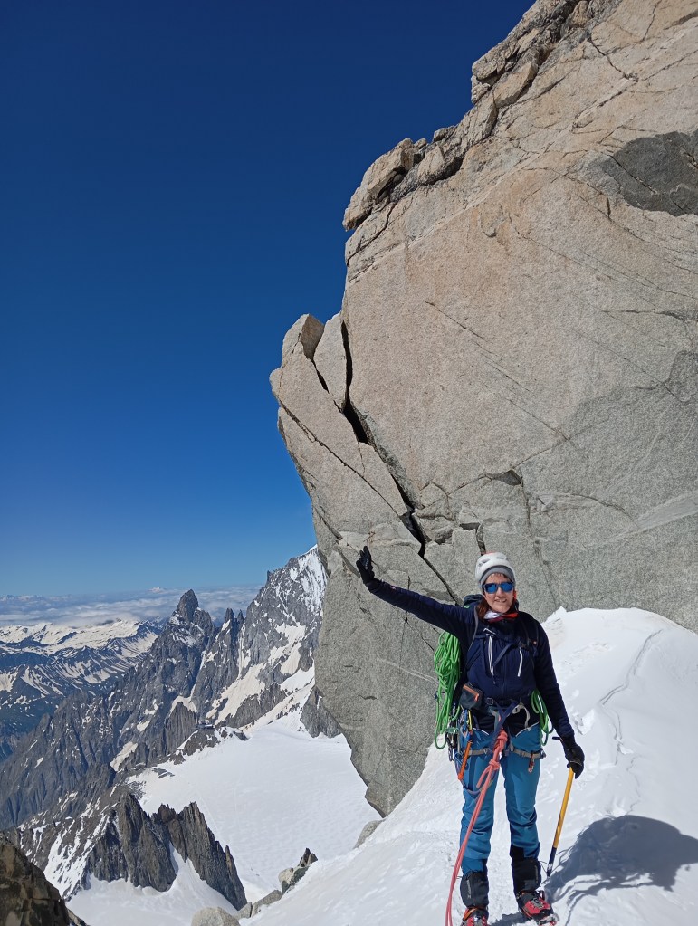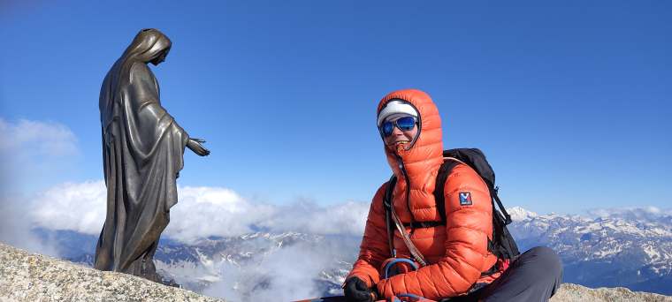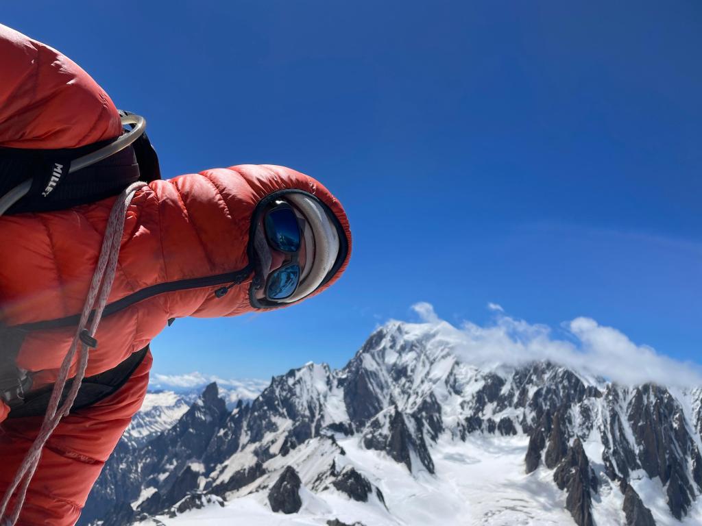 Et paf de nouveau vent pleine face pour cocher le sommet et saluer la Madone à plus de 4000 mètres ! Un premier 4000 pour Laura, trop beau ! On n’est pas peu fières, une vue imprenable sur le massif s’offre à nous. Les Grandes Jorasses semblent à portée de main, la muraille nous paraît infranchissable… Au loin, se dessinent les Écrins avec la Barre et Reine Meije.