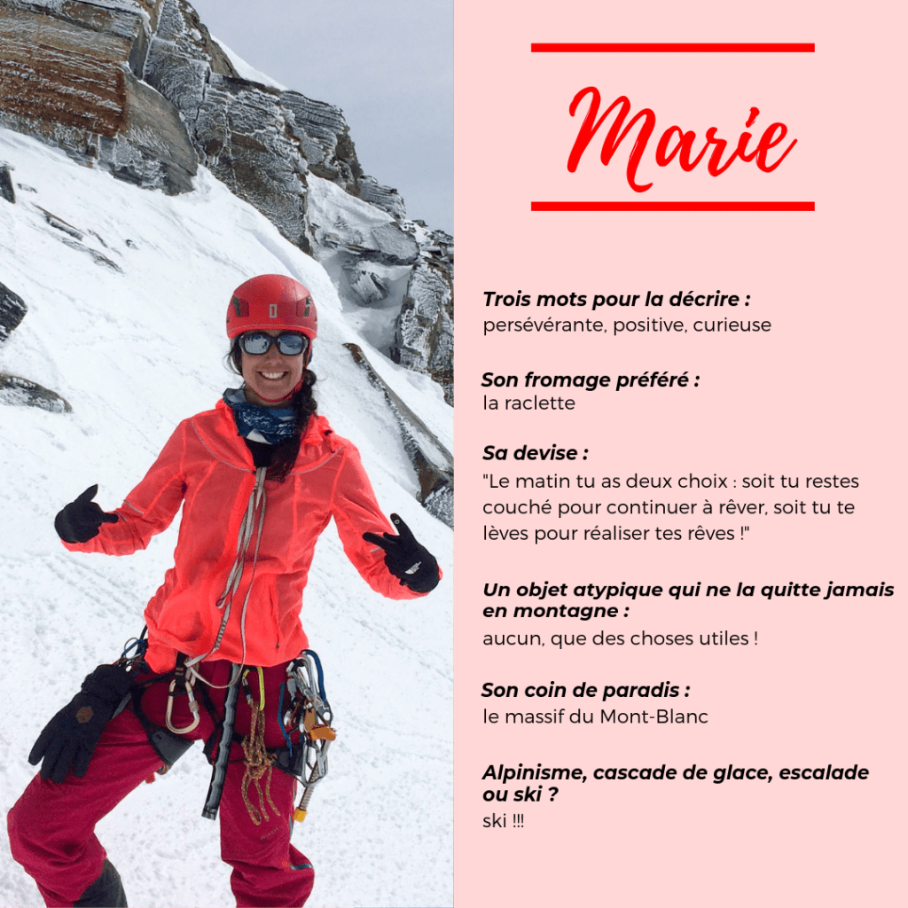 Marie, c’est la fille dynamique toujours en quête d’émotions fortes. Aventurière avant tout, à la recherche de beaux sommets insolites ! Elle voit la montagne comme un merveilleux espace de liberté où, plus qu’ailleurs encore, l’on doit faire preuve d’humilité. Originaire de Chambéry elle travaille dans le développement de programmes pédagogiques en lien avec les problématiques liées au changement climatique.