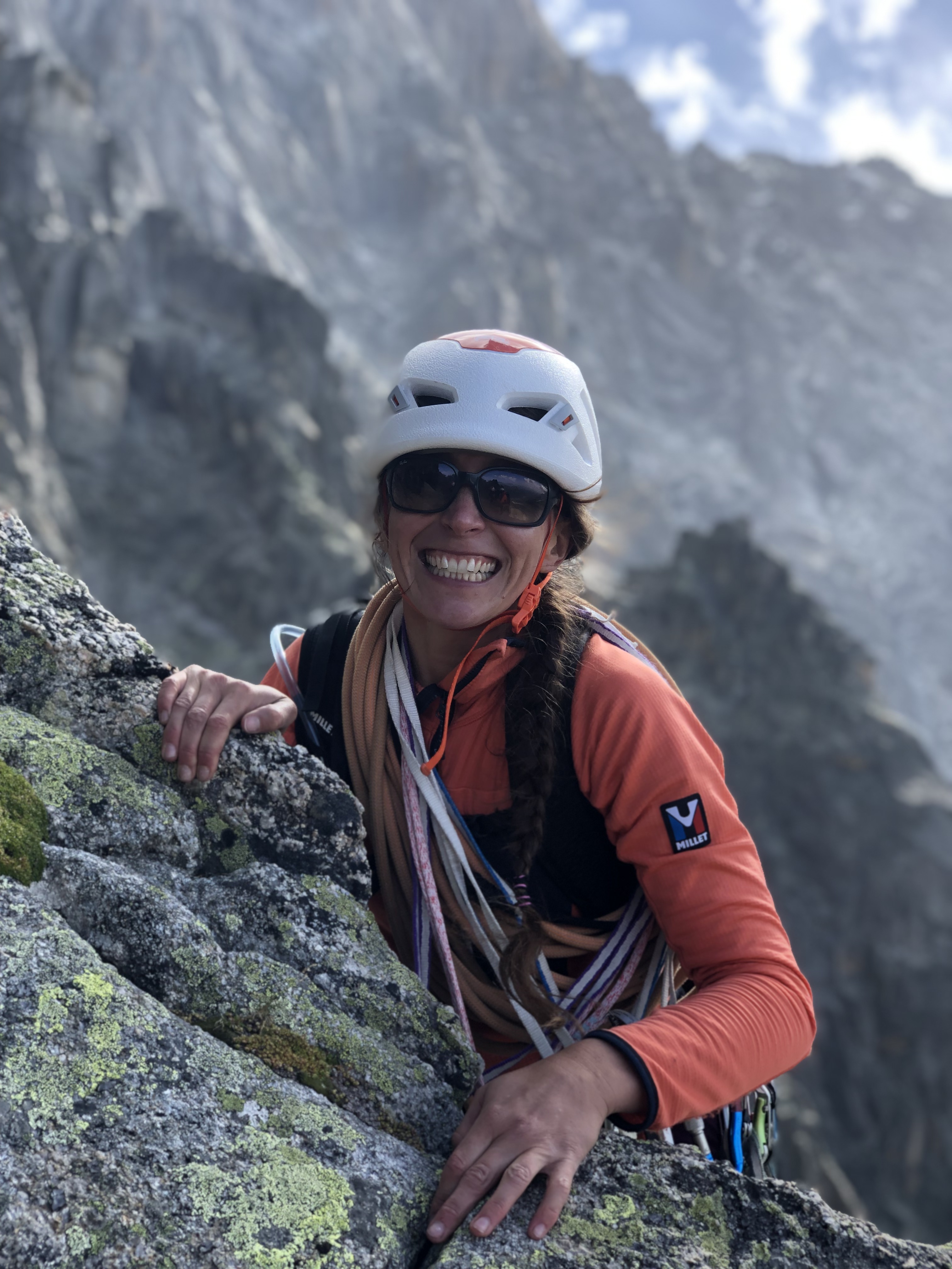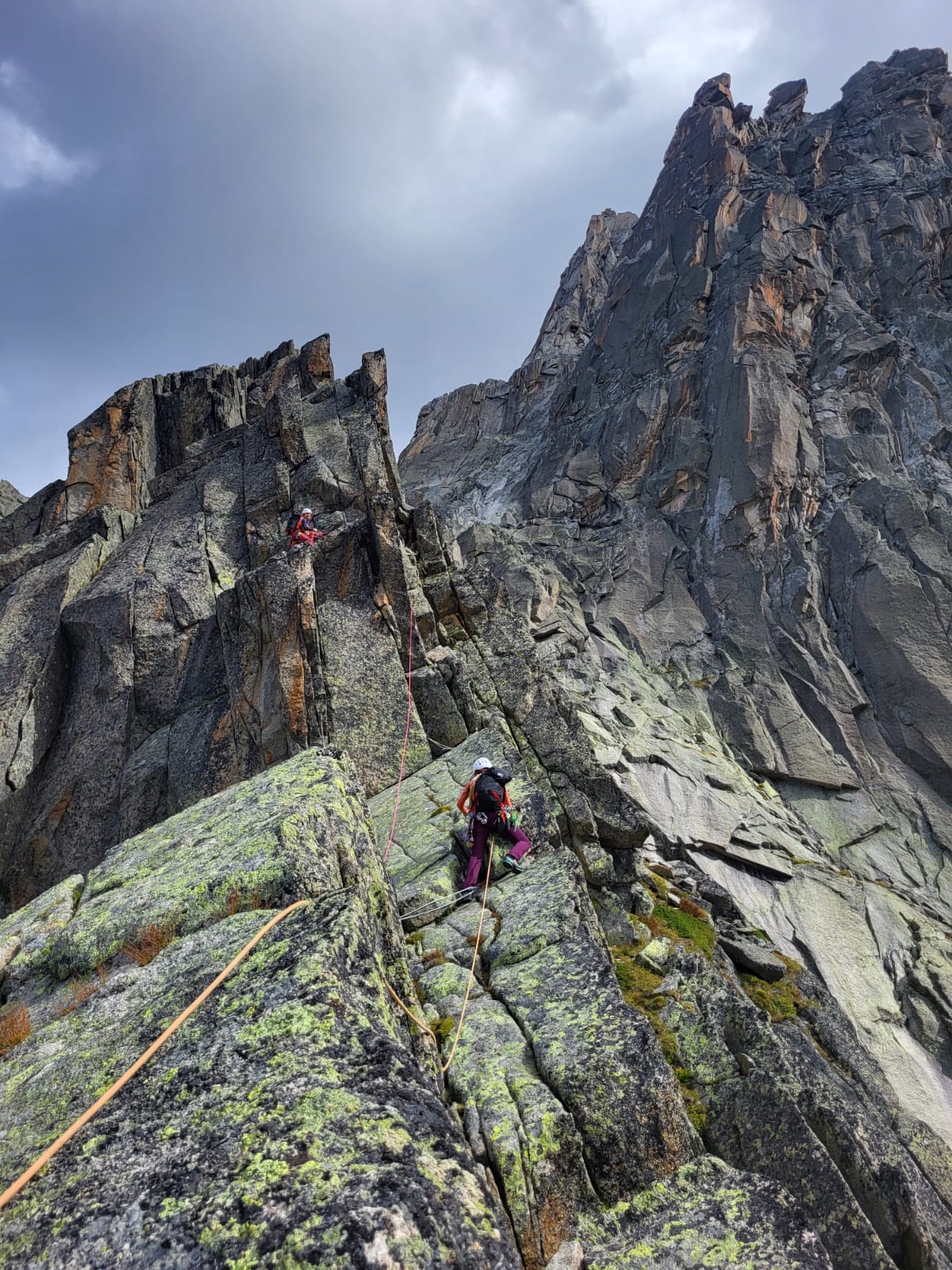 On en était où ? Ah oui l’approche. Elle est efficace, nous voilà arrivées à la 1ère pente de neige, on s’encorde sur un replat, on sort les broches, friends, sangles, dégaines. La 1ère s’engage jusqu’en bas du 1er cigare où elle fait relai sur broches.